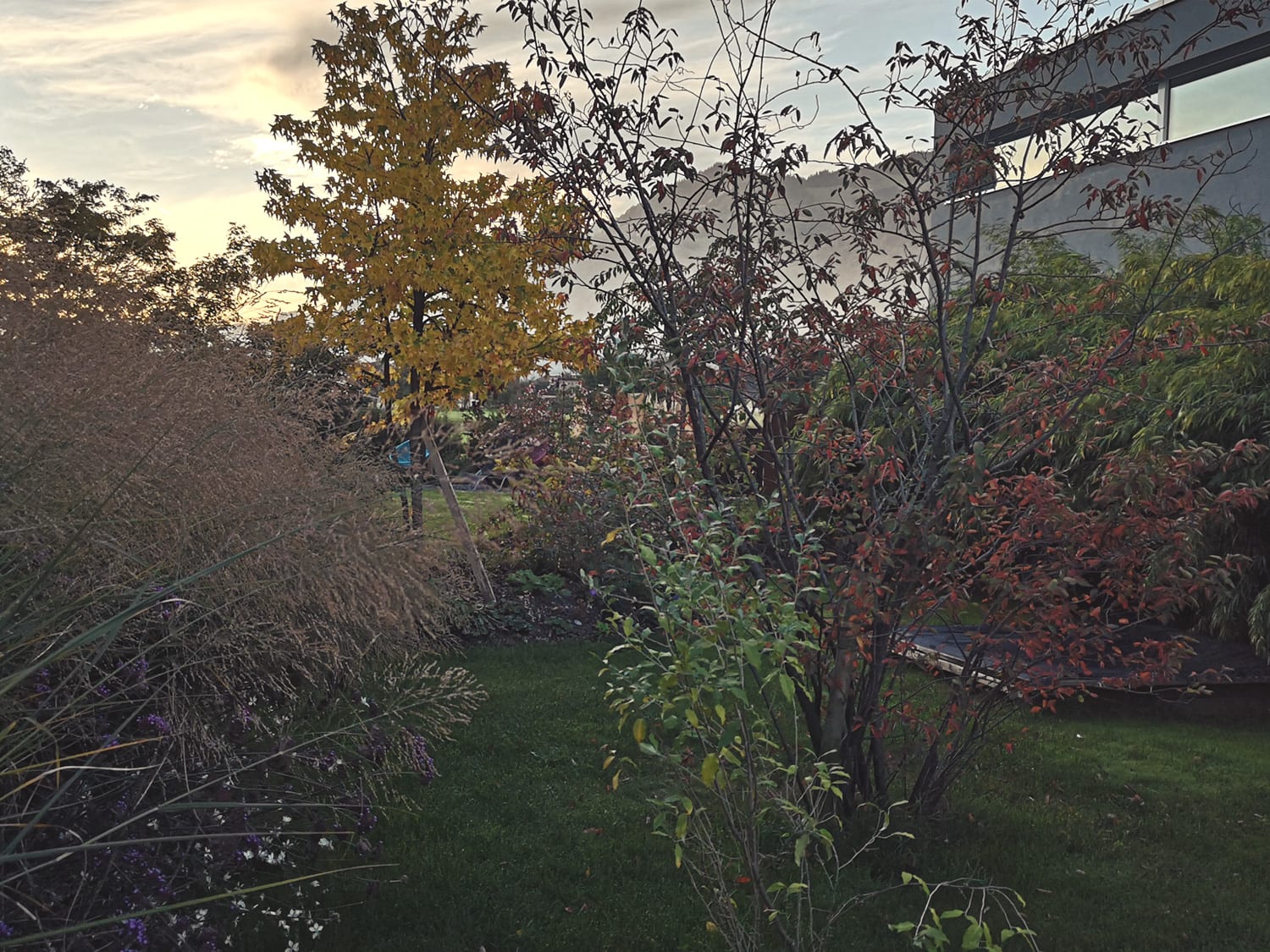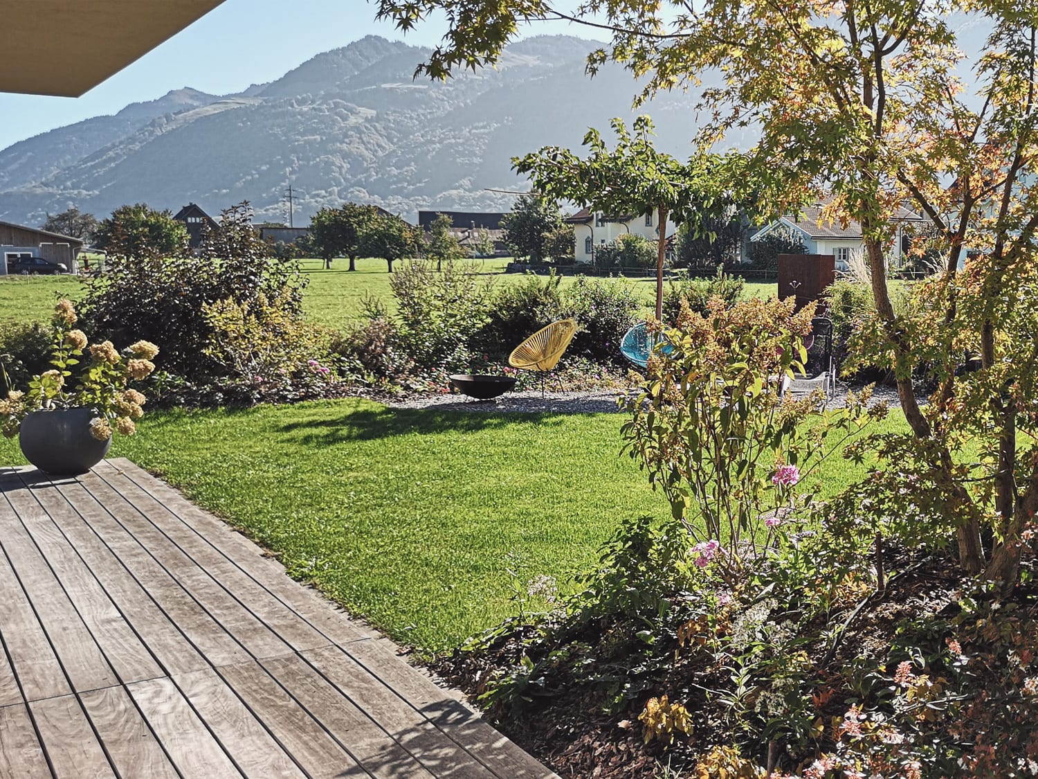 Der Garten bestand aus einem Grossen Rasen mit einigen Sträucher und Stauden als Sichtschutz entlang den Grenzen. Am Dorfrand gelegen mit Blick in die Berge und das offene Feld fand sich eine gute Grundlage. Der Wunsch war, die Grosse Wiesenfläche mit Pflanzen in Räume aufzuteilen und zugleich einen guten Sichtschutz zum Neubau auf dem Nachbarsgrundstück zu schaffen. Es soll mehr Geborgenheit entstehen und der Charme der Umgebung aufgenommen werden.