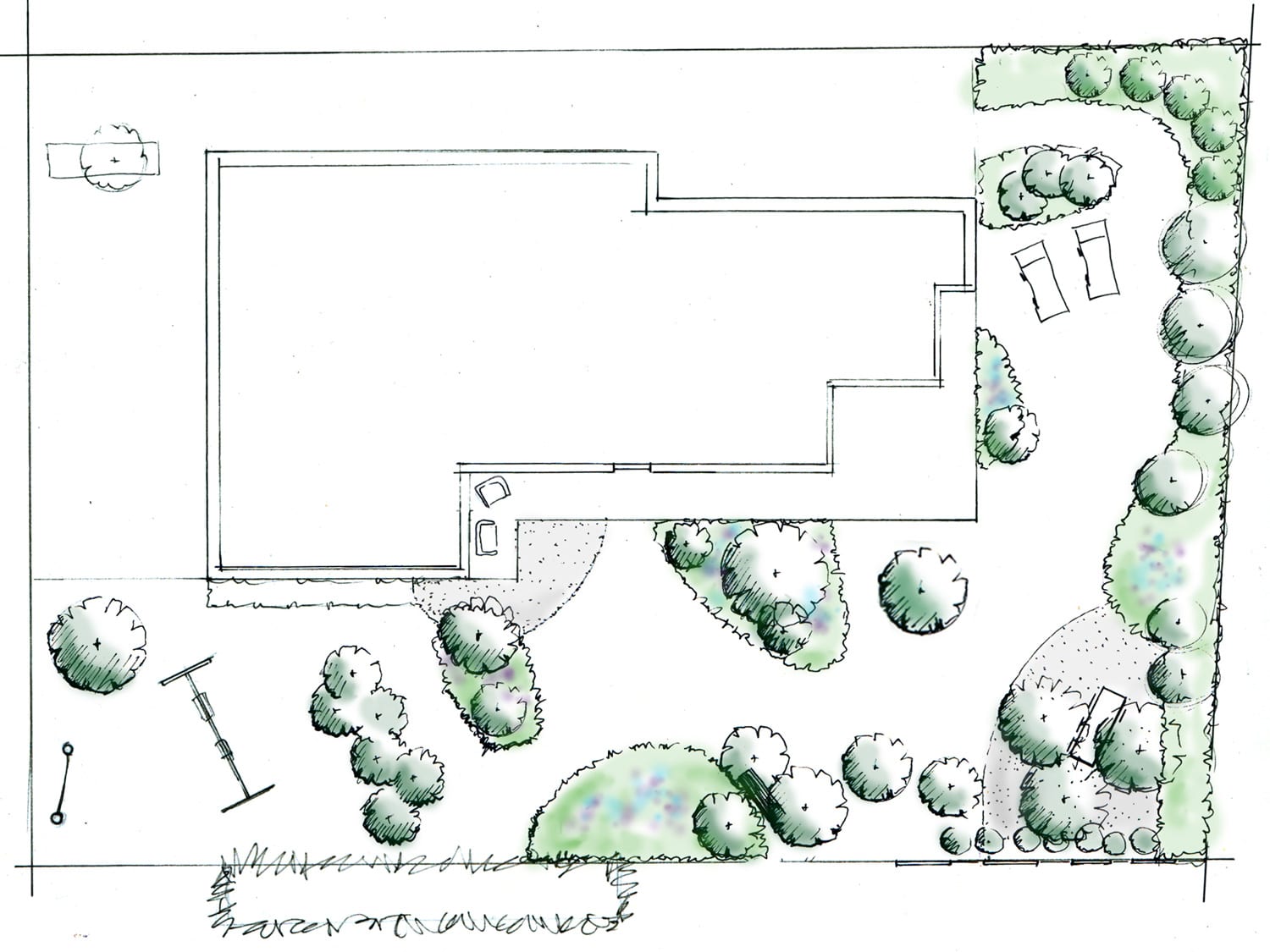 Die Pflanzflächen wurden diagonal verschoben angeordnet und immer erhöht. Dies erzielt einen angenehmen, Geborgenheit Effekt auf der riesigen Rasenfläche welche damit in fünf Räume aufgeteilt wurde. Ein neuer Kiesplatz wurde im Windgeschützten Ecken angelegt und ein bestehender Kiesplatz im Süden wurde vergrössert. Eine Staffelung von hohen Bäumen, Sträuchern und Stauden geben dem Garten ein natürliches Erscheinungsbild.