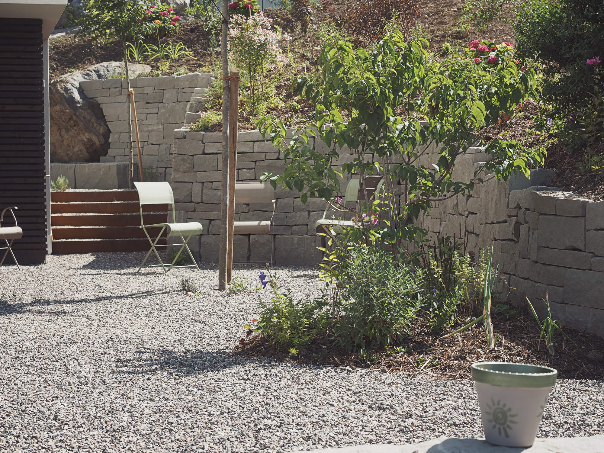Die Formgebung der Mauern, als Grundgerüst des Gartens, wurde Polygonal gewählt. Die geraden Linien nehmen die Geraden der Architektur auf, fügen sich weich in die Landschaft ein und ermöglichen es mit wenigen Ecken und entsprechendendem Aufwand, Räume zu schaffen. Die etwas höhere Terrasse wurde mit einem noch höheren Stahltrog gehalten um das Gefühl vom Herunterfallen zu beseitigen. Der untere Terrassenbereich wurde teilweise mit Kies und Pflanzflächen gestaltet sowie einen Schattenbaum so nah wie möglich an die Terrasse gepflanzt. Ganz besonders ist ein Riesenfindling welcher vor dem Abtransport gerettet, und stattdessen in die Gestaltung integriert wurde.