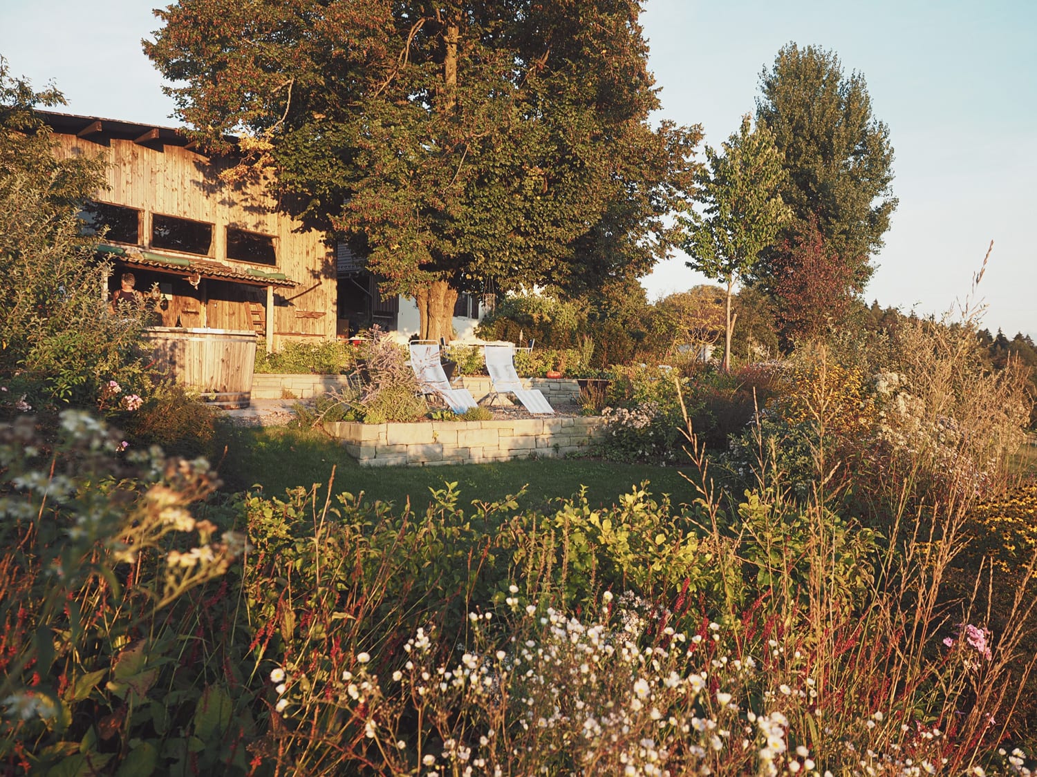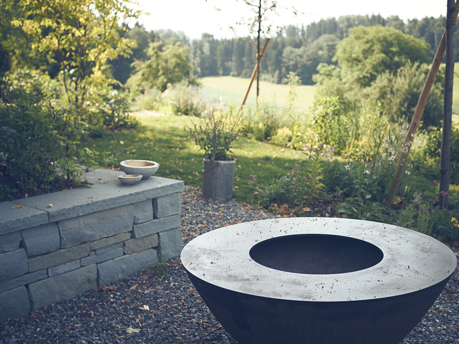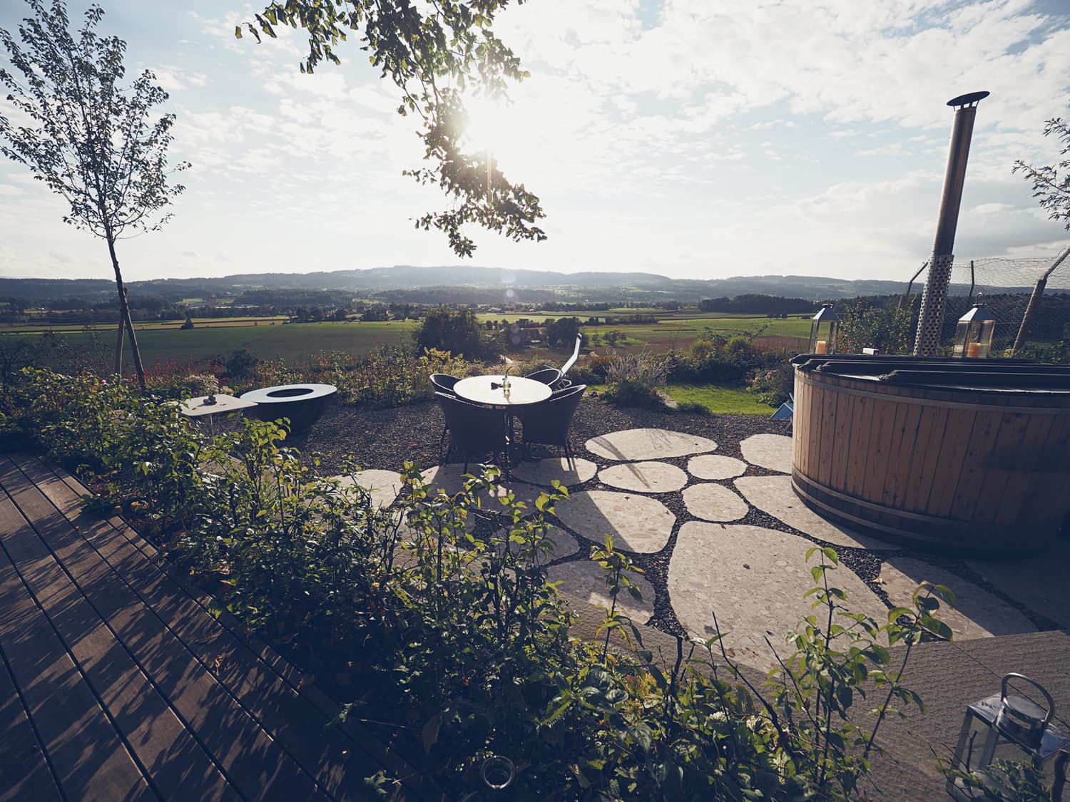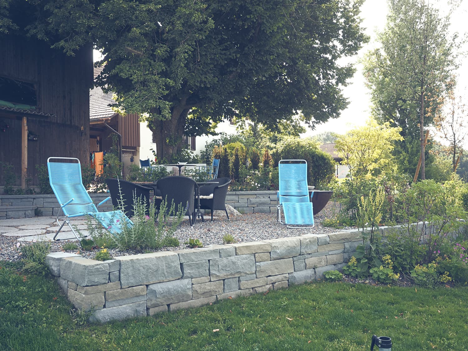 Das Hanggelände wird mit zwei Natursteinmauern in drei Ebenen unterteilt. Auf der obersten Ebene, unter der Linde, entsteht ein Holzdeck, die nächste Ebene bietet auf einem Belag aus filetierten Findlingen Platz für einen Hotpot und auf der dritten Ebene verschmelzen die angrenzenden Wiesen durch eine Staudenbepflanzung mit einer Rasenfläche. Hecken und Sträucher gliedern den Raum und unterstützen die Aussicht.