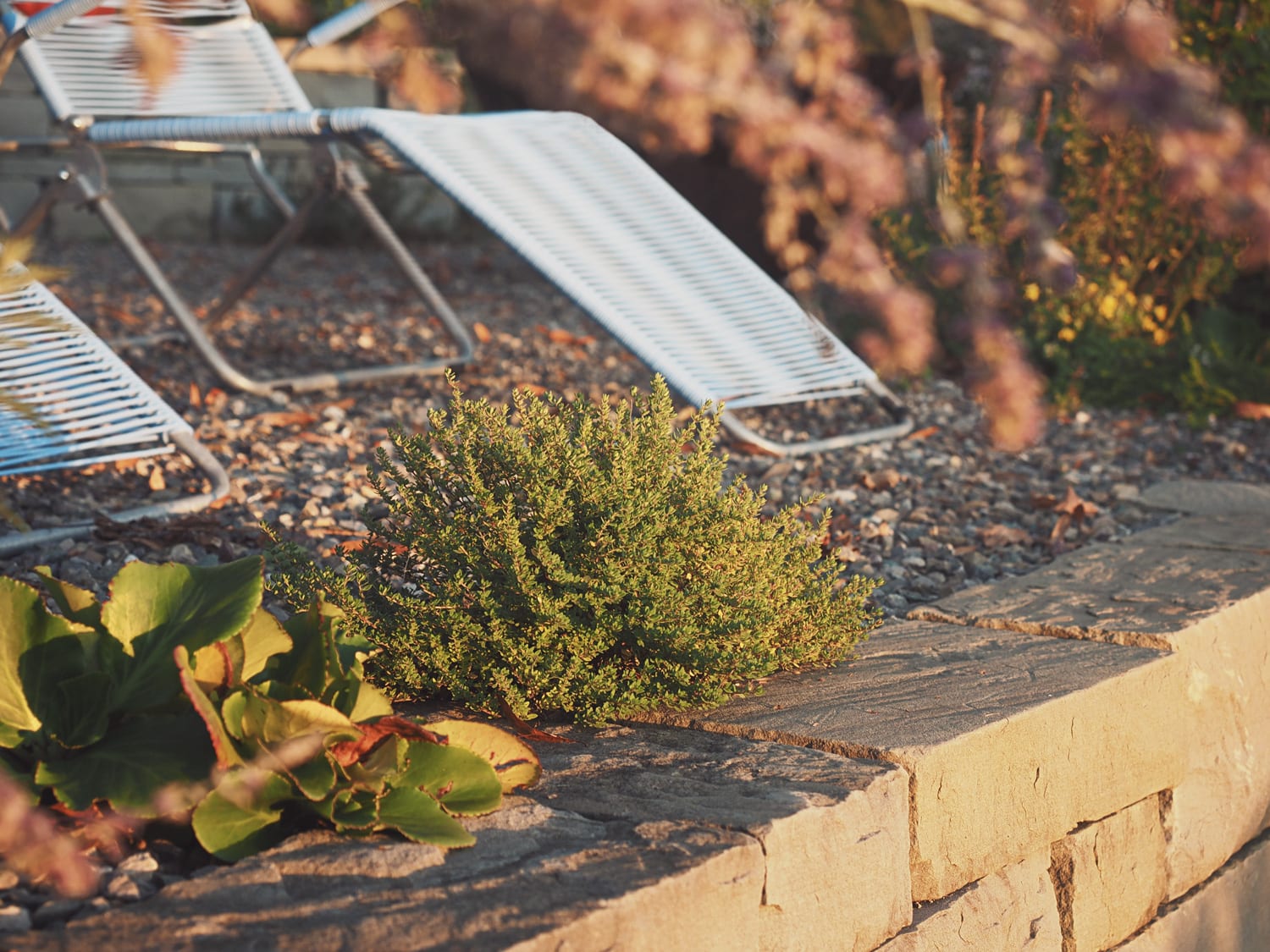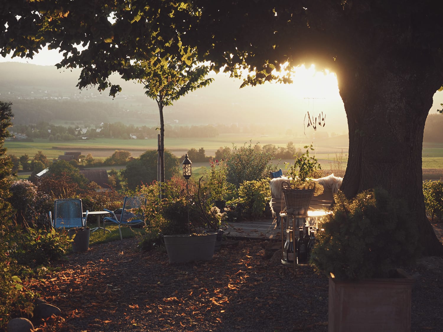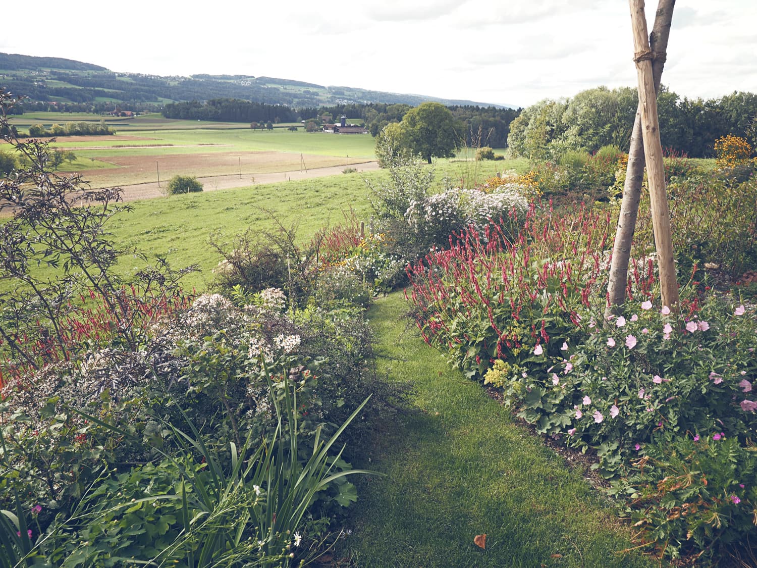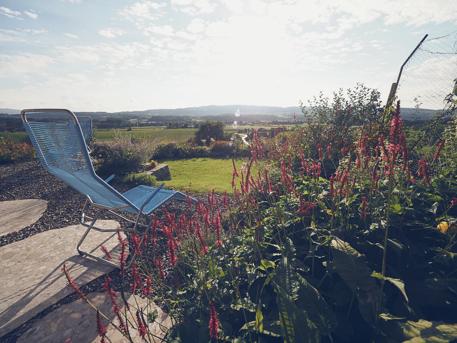 Das Hanggelände wird mit zwei Natursteinmauern in drei Ebenen unterteilt. Auf der obersten Ebene, unter der Linde, entsteht ein Holzdeck, die nächste Ebene bietet auf einem Belag aus filetierten Findlingen Platz für einen Hotpot und auf der dritten Ebene verschmelzen die angrenzenden Wiesen durch eine Staudenbepflanzung mit einer Rasenfläche. Hecken und Sträucher gliedern den Raum und unterstützen die Aussicht.