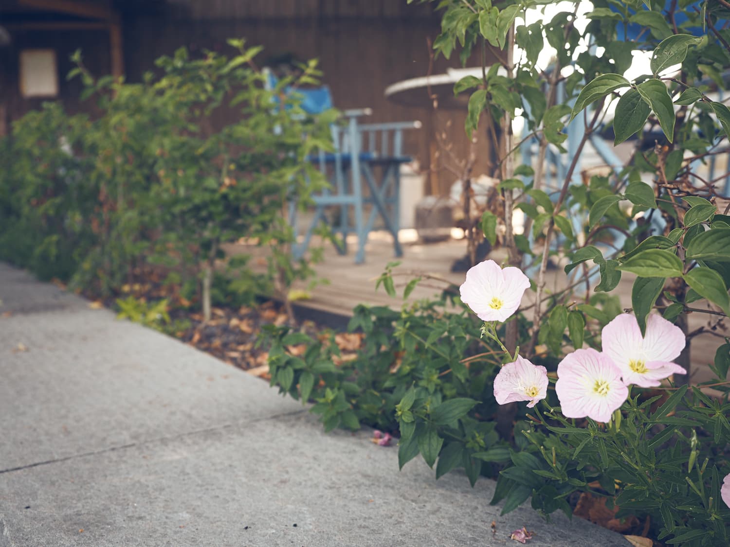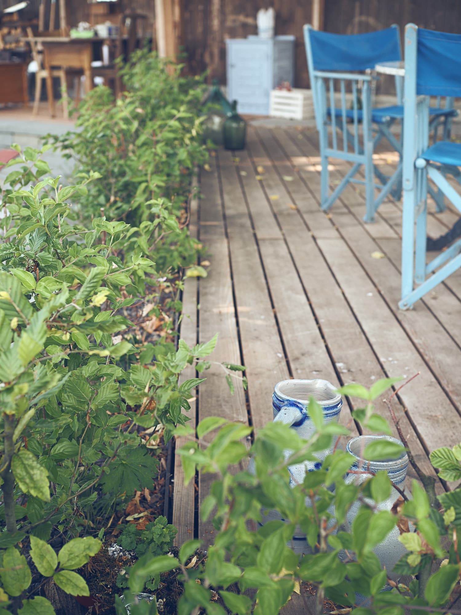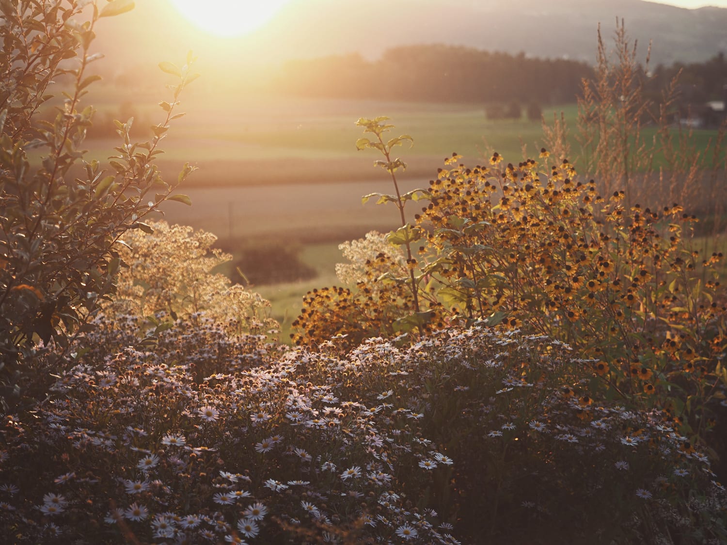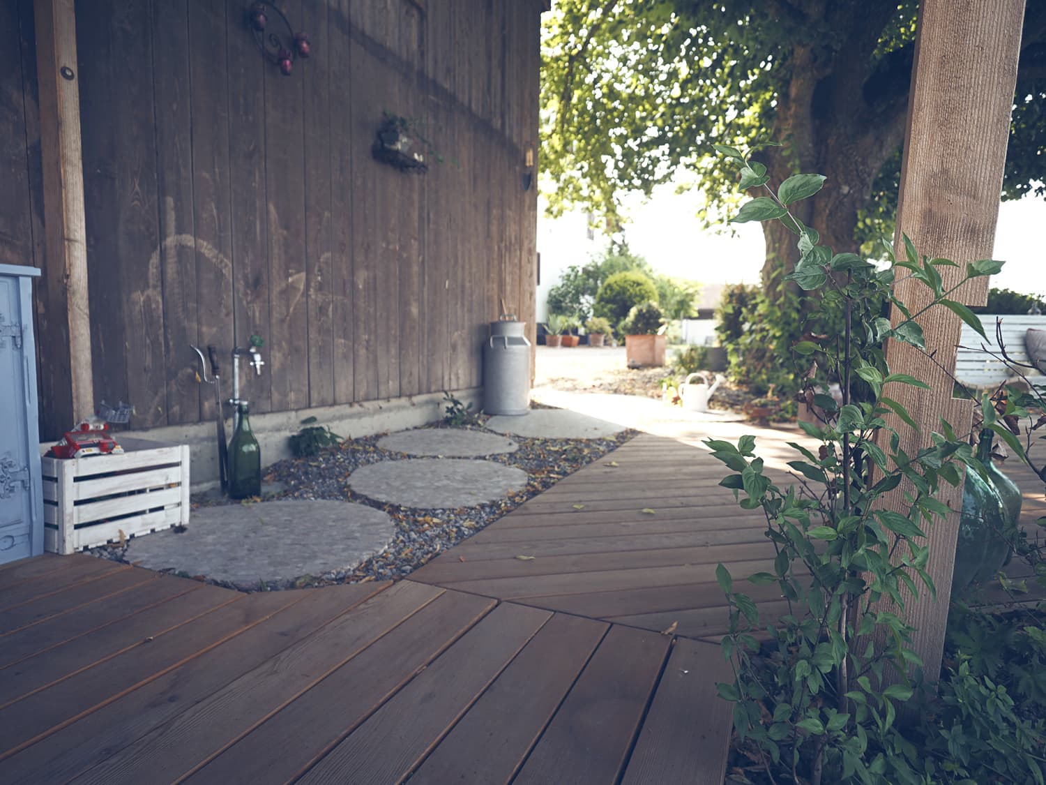Das Hanggelände wird mit zwei Natursteinmauern in drei Ebenen unterteilt. Auf der obersten Ebene, unter der Linde, entsteht ein Holzdeck, die nächste Ebene bietet auf einem Belag aus filetierten Findlingen Platz für einen Hotpot und auf der dritten Ebene verschmelzen die angrenzenden Wiesen durch eine Staudenbepflanzung mit einer Rasenfläche. Hecken und Sträucher gliedern den Raum und unterstützen die Aussicht.
