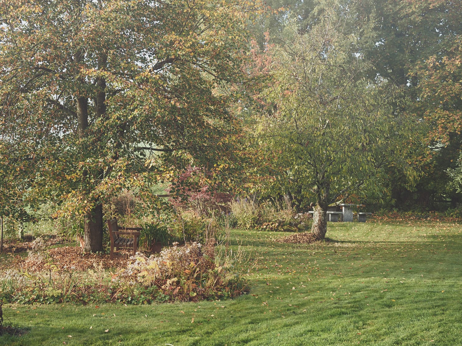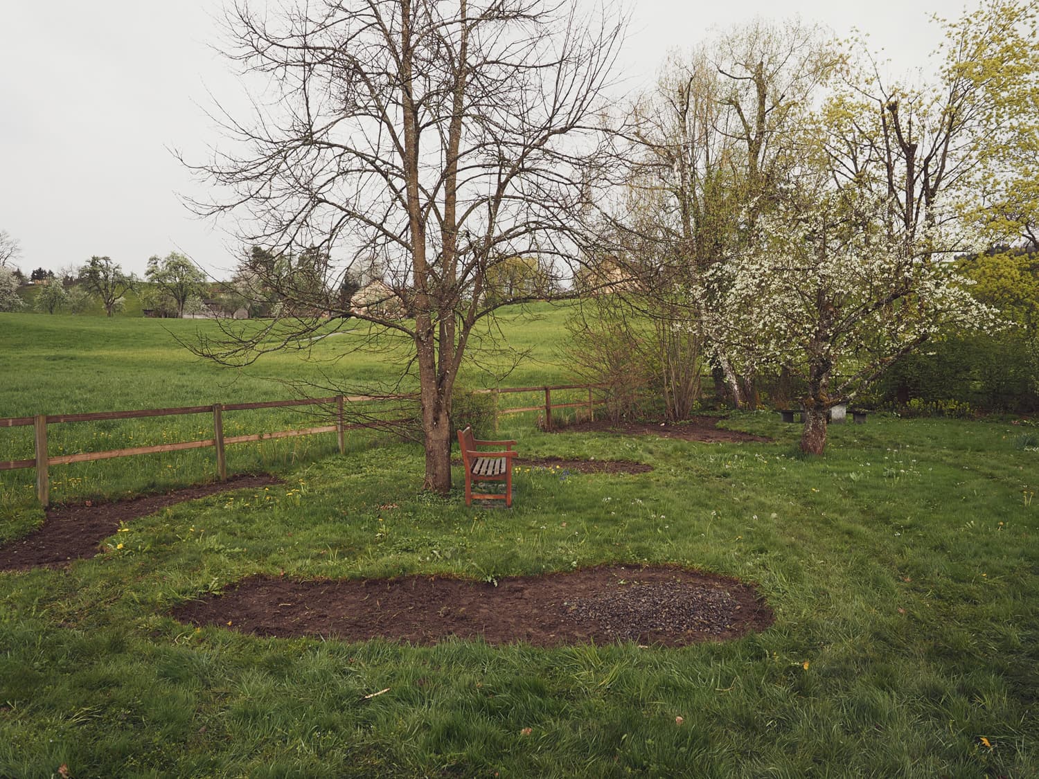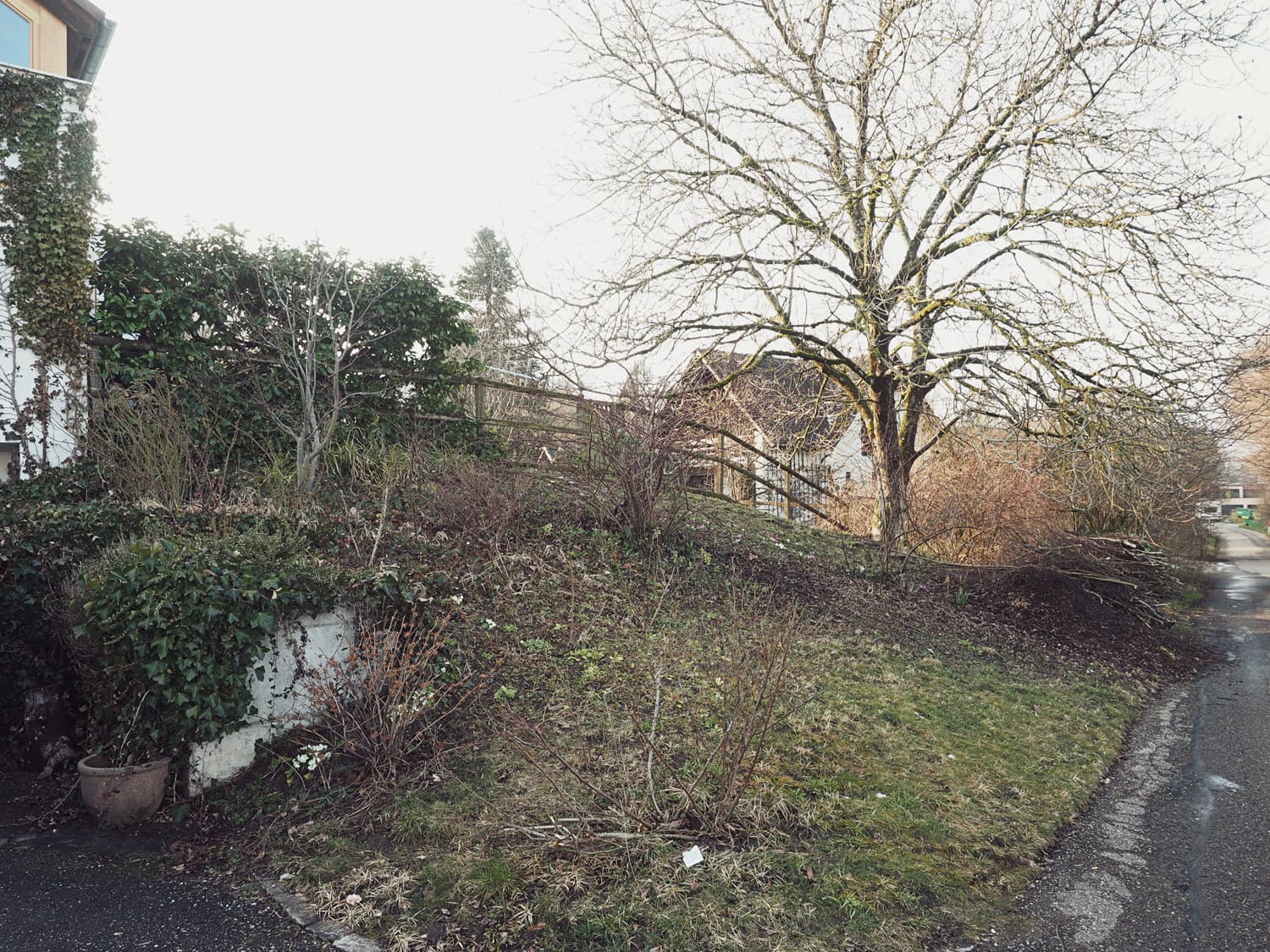 Der Garten am Rande vom Wohngebiet, der Nähe zum Wald und der offenen Wiesen verschmilzt mit seiner Umgebung. Ein kleines Wäldchen und grosse Bäume gehören ebenso zum Inventar wie der seit Jahren genutzte Gemüsegarten. Der Garten soll mit Stauden farbiger werden. Die Herausforderungen waren der lehmige nasse Boden und die unterschiedlichen Bereiche von tiefem Schatten mit Wurzeldruck bis zu vollsonnigen Bereichen