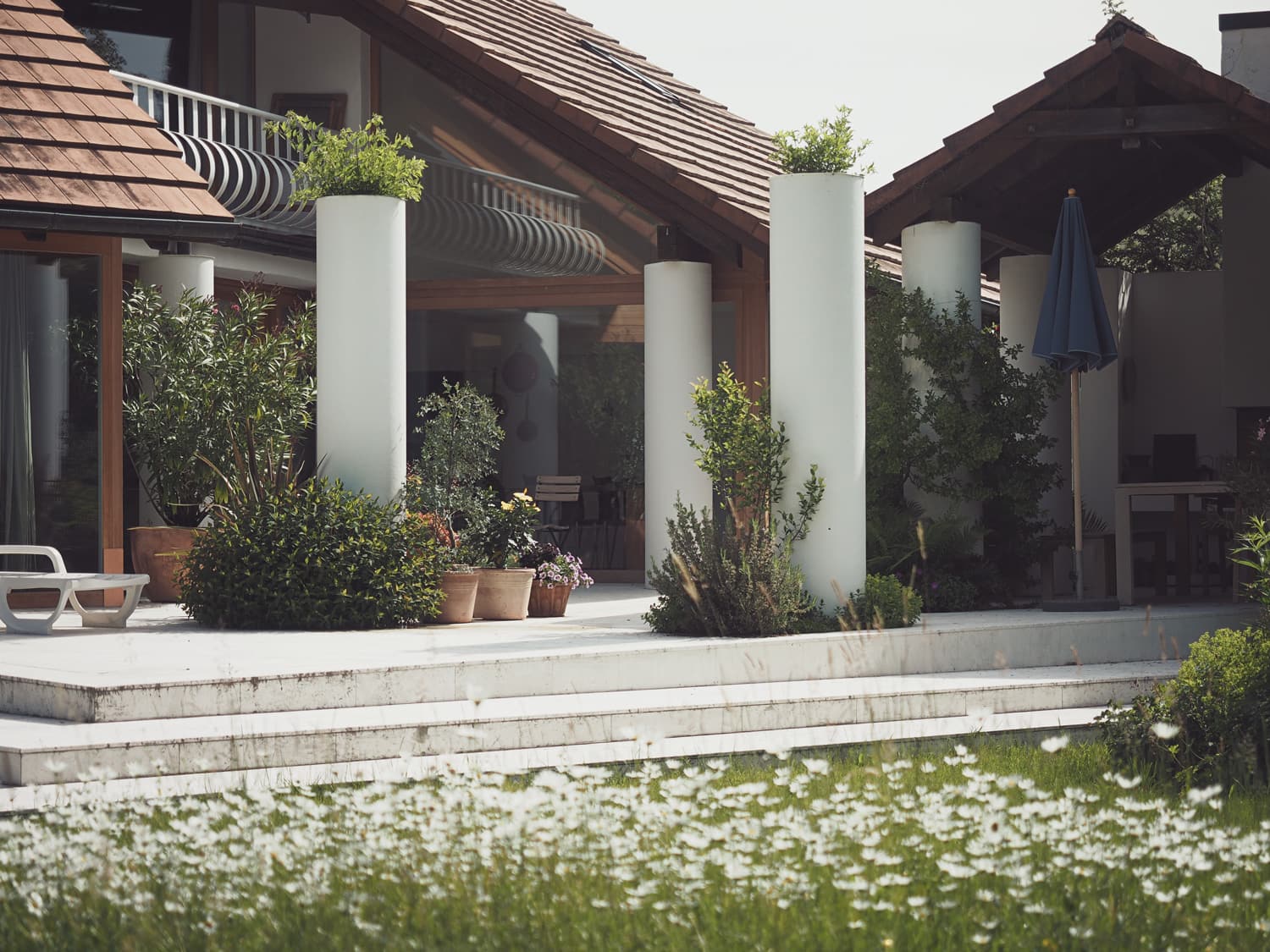 Bestehende Rabatten wurden teilweise mit Substrat aufgebessert und komplett neu bepflanzt. Dazu wurden speziell für den Ort Staudenmischpflanzungen zusammengestellt. Die anspruchsvollen Bereiche unter den Bäumen mit wechselnden Lichtverhältnissen wurden mit entsprechenden Stauden bepflanzt. Grossblättrige Stauden und flächenartige Pflanzgruppen erzielen in der Grossräumigkeit die nötige Wirkung. Weisse Blüten vor dunklem Hintergrund und Gelb- Rote für die Fernwirkung in der Sonnen sind weitere Lösungen für den Umgang mit den Grossen Flächen.