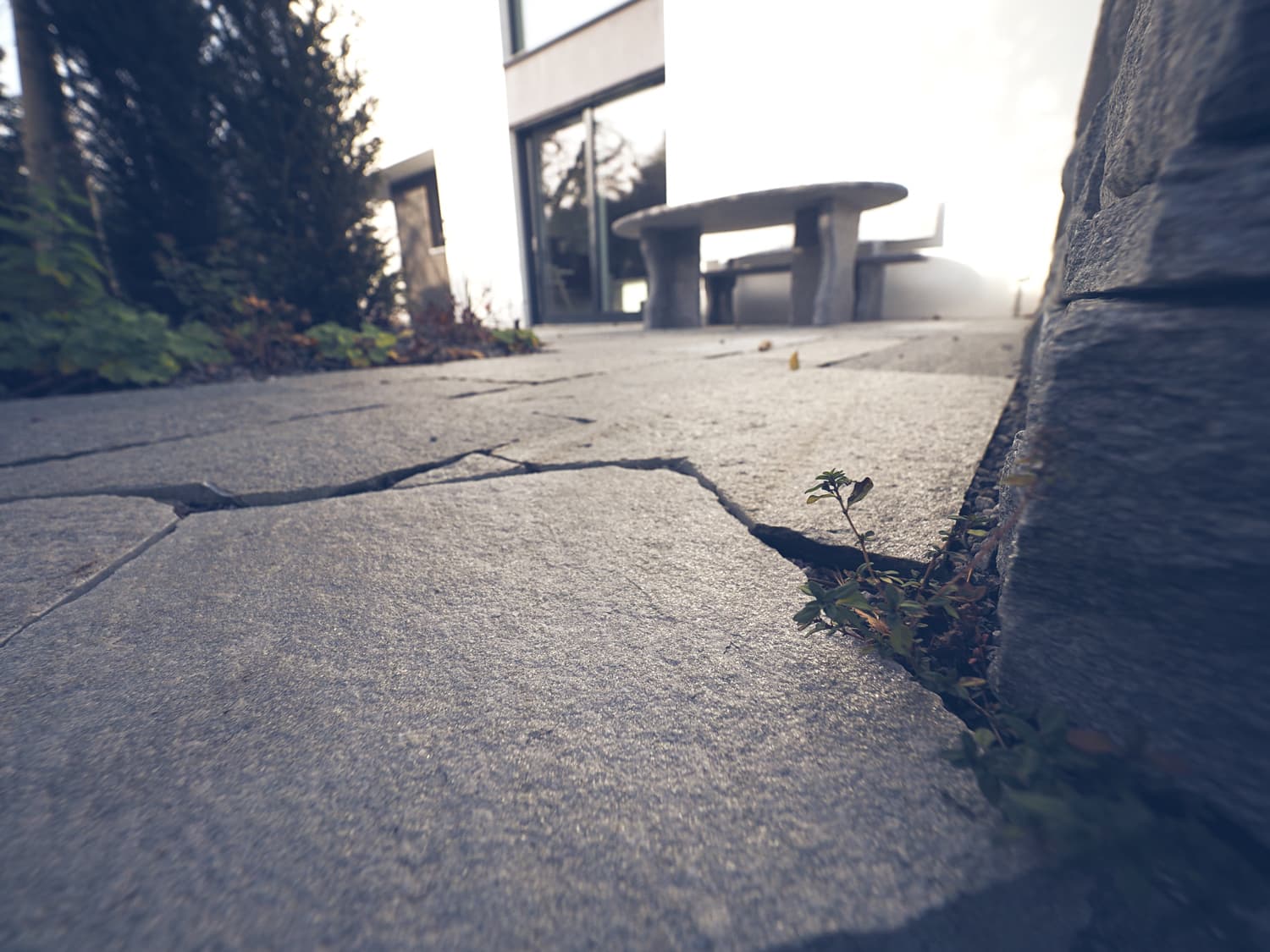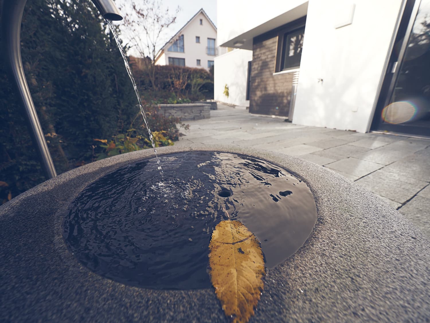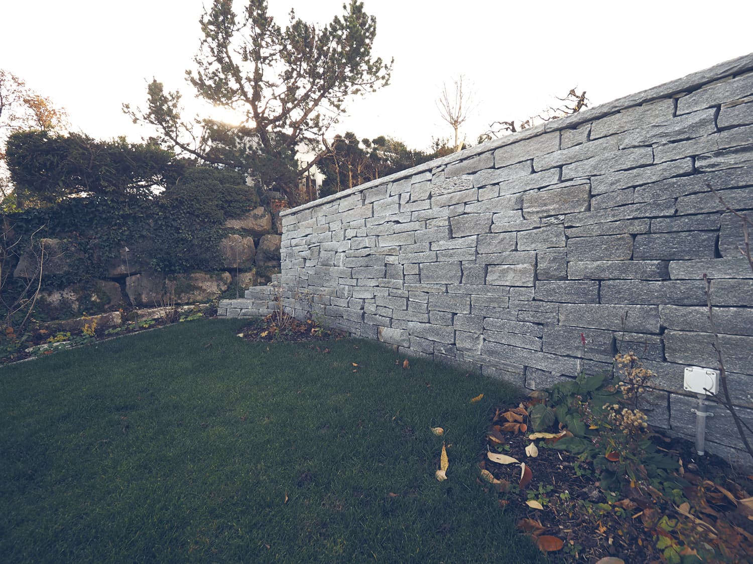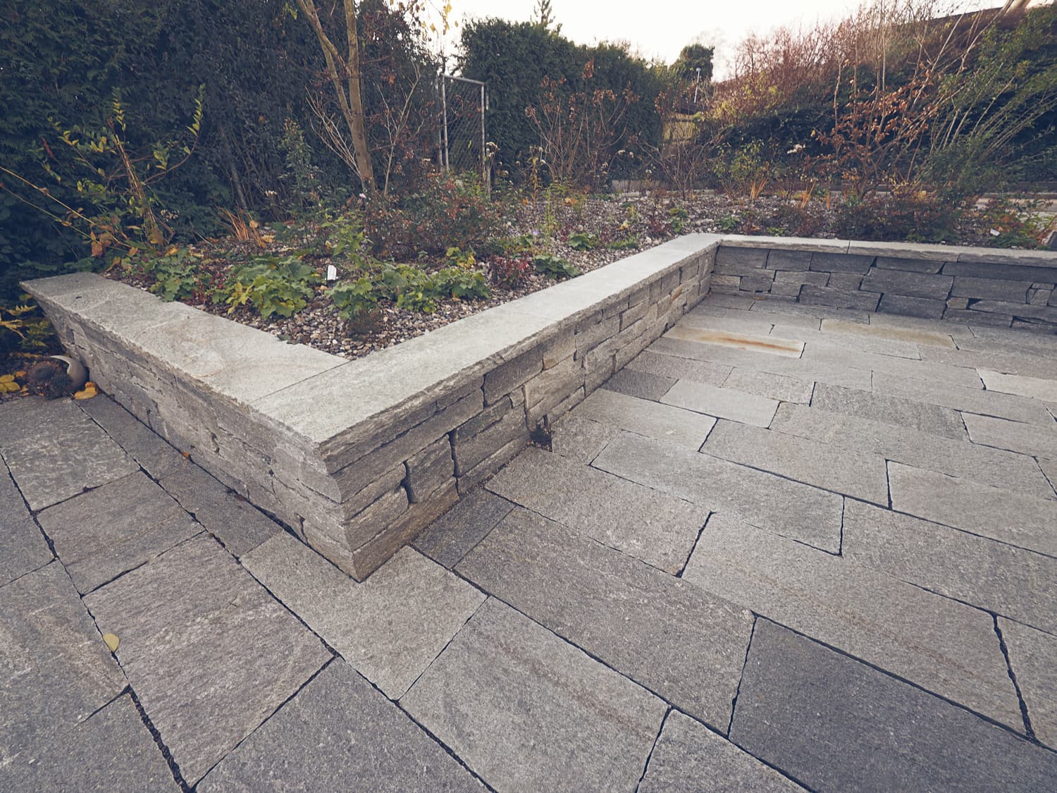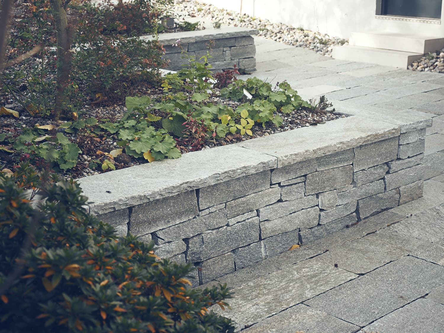 Die bestehende Terrassierung wird mit zwei Natursteinmauern hervorgehoben und verstärkt. Eine grosszügige Platzfläche, angrenzend an die Wohnküche, bietet nun mit einem Brunnen und einem Natursteintisch viel Aufenthaltsqualität und Raum für die Familie. Der untere Gartenbereich ist durch bunte Staudenpflanzungen und eine Feuerstelle als attraktiver Aufenthaltsbereich mit Blick in die Landschaft aufgewertet worden.