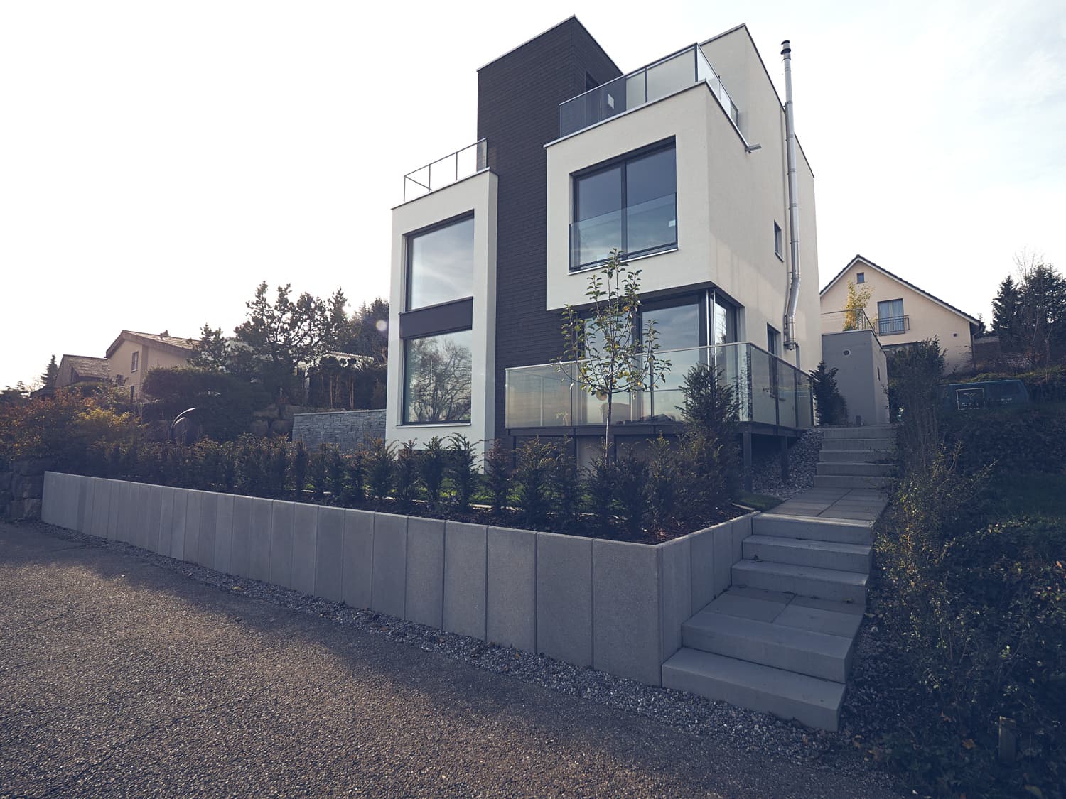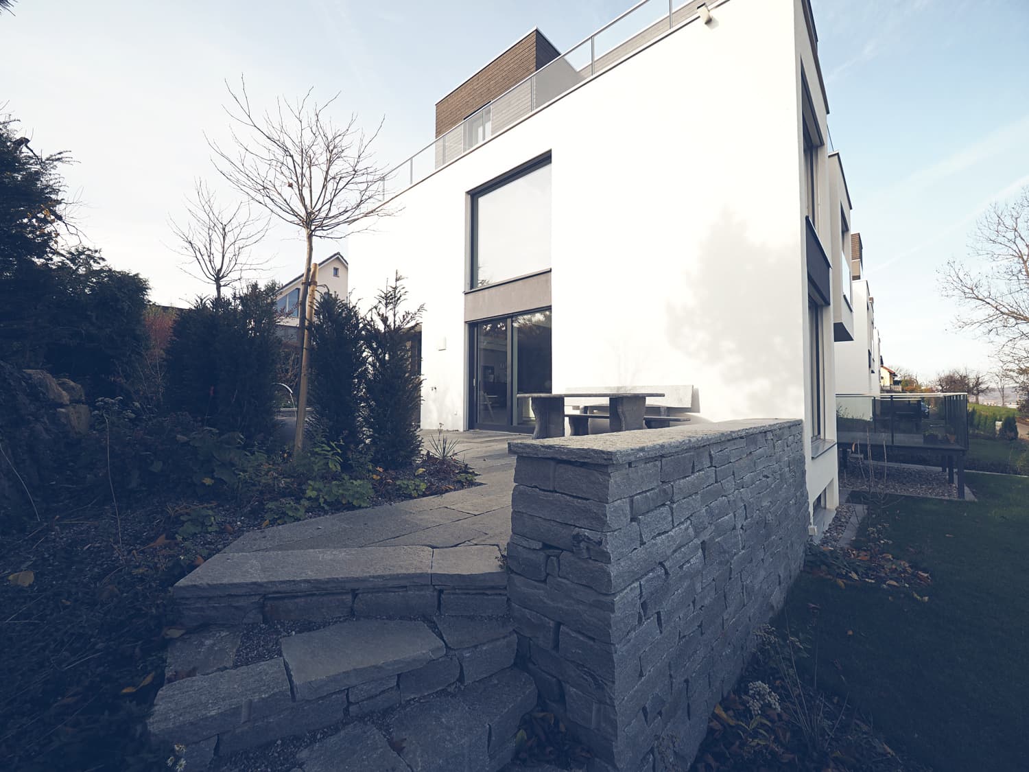 Der Garten des Neubau-Einfamilienhauses befindet sich auf der Südseite und fällt von Westen nach Osten, von der Zufahrt in Richtung freie Landschaft ab. Im Bestand wurden mithilfe zweier Böschungen drei Ebenen geschaffen.