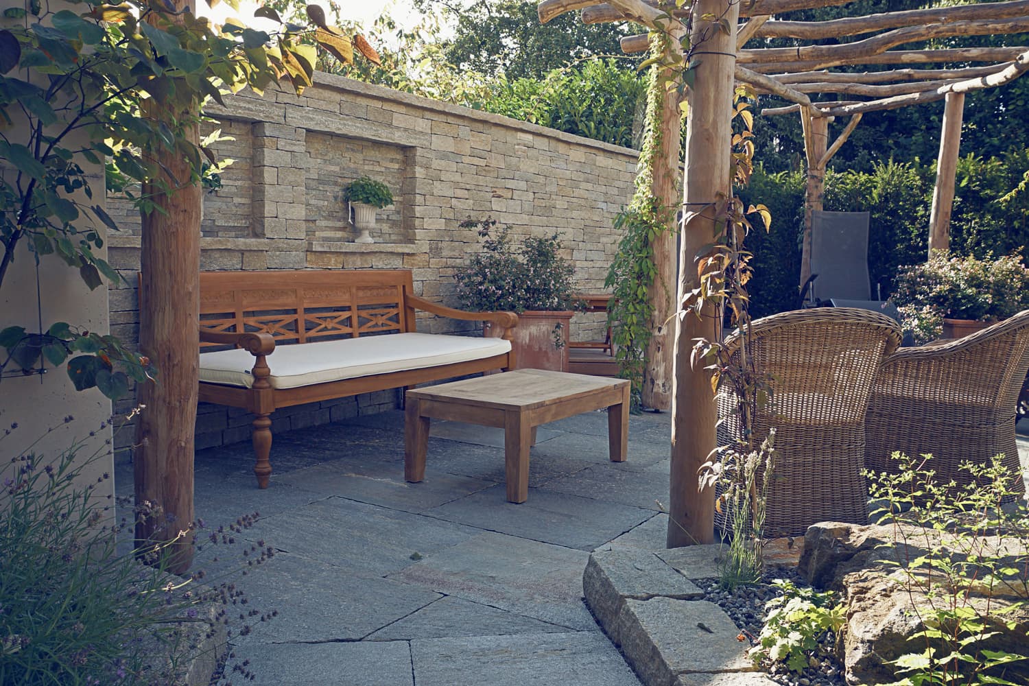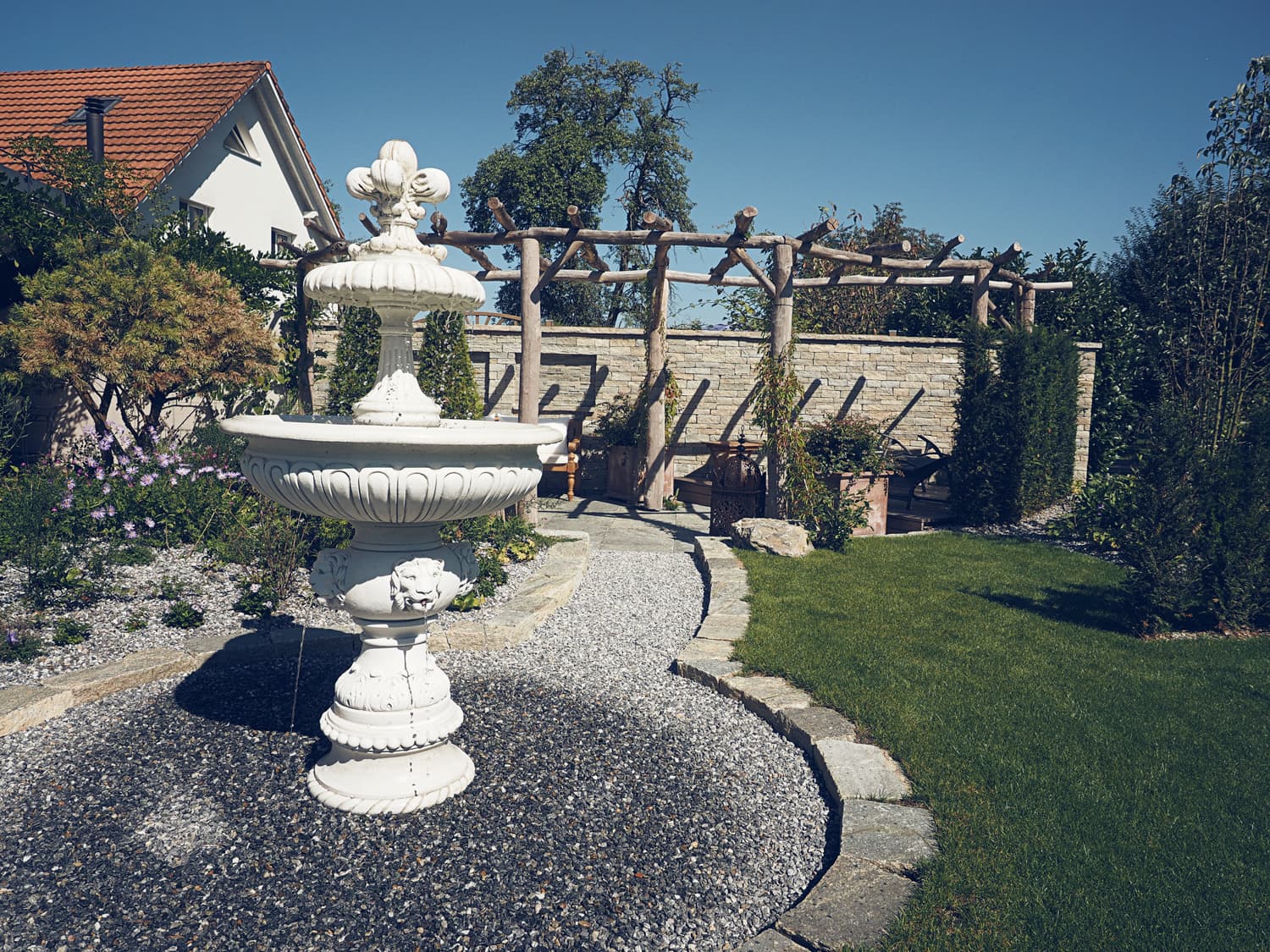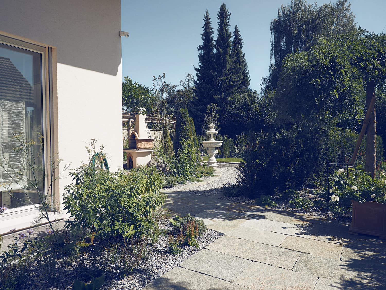 Der grosse Sitzplatz vor einer Natursteinmauer bildet der Hauptbestandteil der Änderung. Damit ist der Garten neu ausgerichtet und schafft eine neue Perspektive über den gesamten Garten. Ein Weg verbindet Sitzplatz Rasen und Pflanzflächen, das Plätschern des Brunnens schafft eine angenehme Geräuschkulisse und verstärkt den Charakter von mediterran.