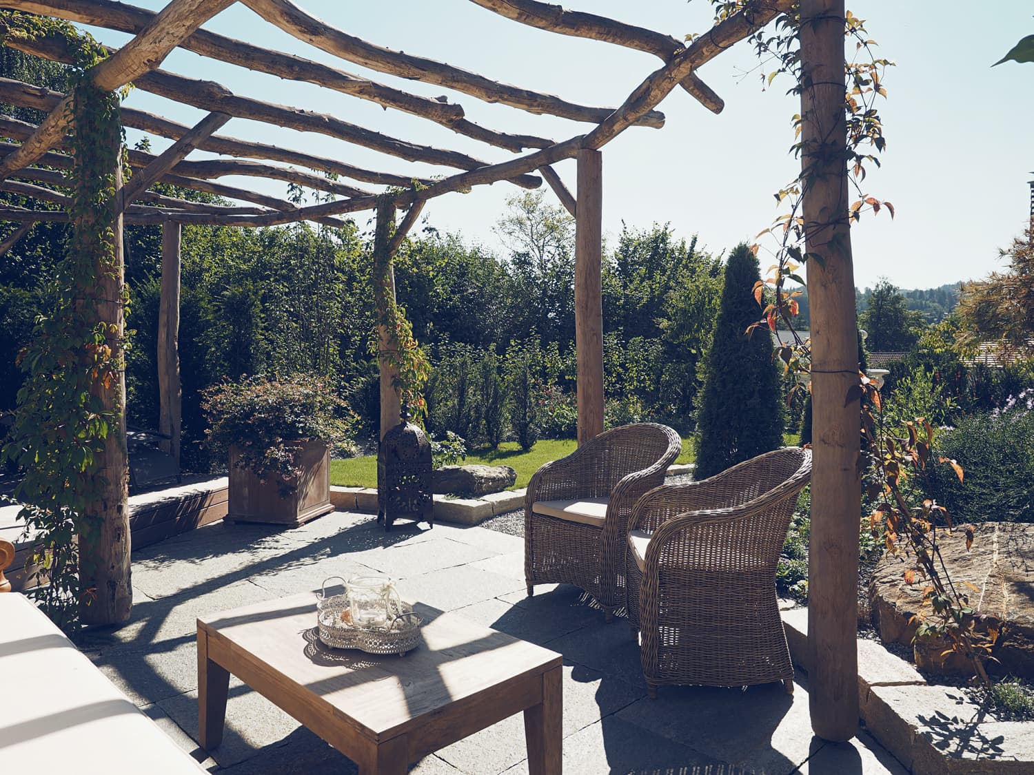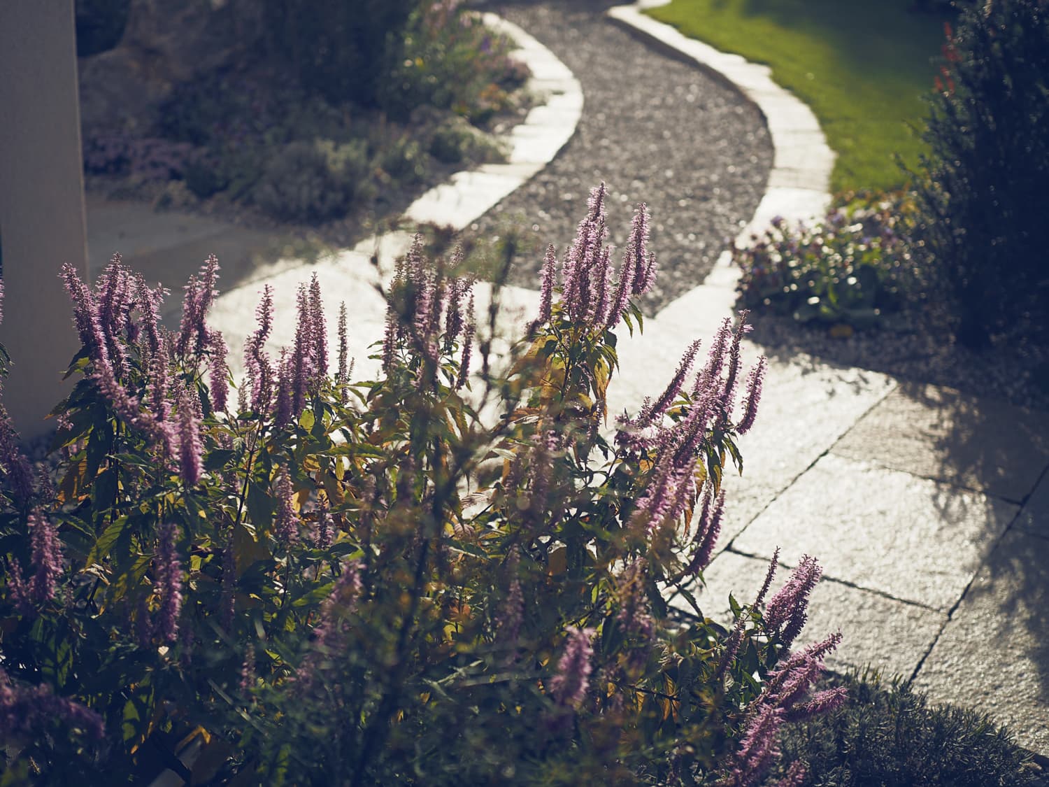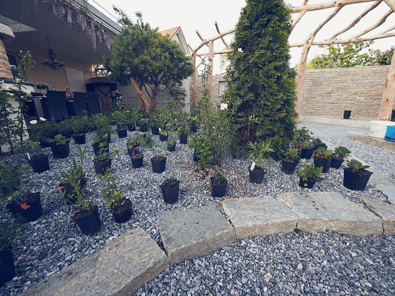 Der grosse Sitzplatz vor einer Natursteinmauer bildet der Hauptbestandteil der Änderung. Damit ist der Garten neu ausgerichtet und schafft eine neue Perspektive über den gesamten Garten. Ein Weg verbindet Sitzplatz Rasen und Pflanzflächen, das Plätschern des Brunnens schafft eine angenehme Geräuschkulisse und verstärkt den Charakter von mediterran.