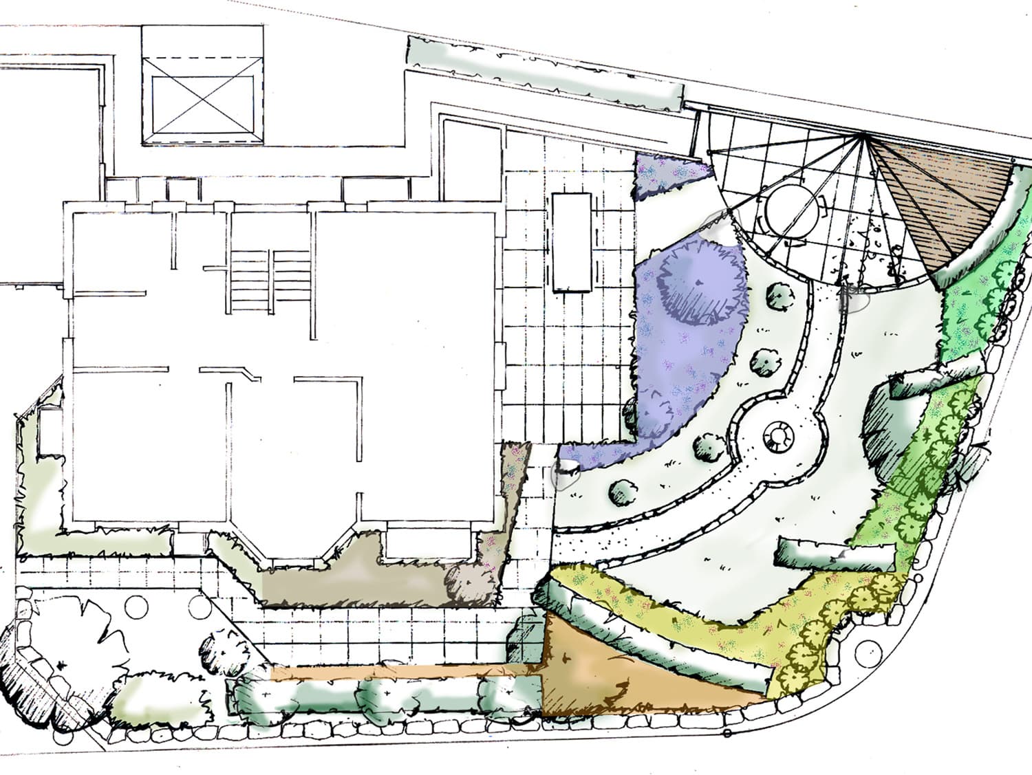 Der 15 -jährige Garten soll vom Kinderfreundlichen Garten mit Spielwiese und Spielgeräten in verschiedene Gartenräume und Wege unterteilt werden. Der Charakter soll mediterran und verwunschen sein.