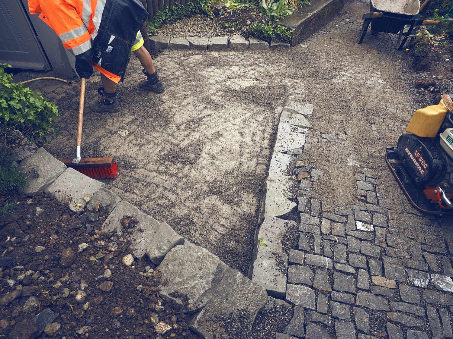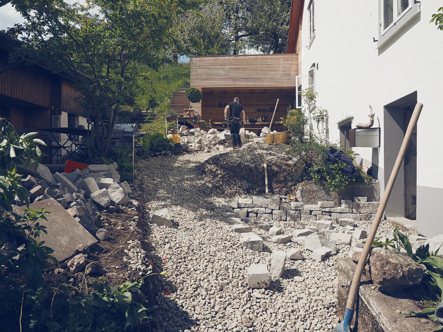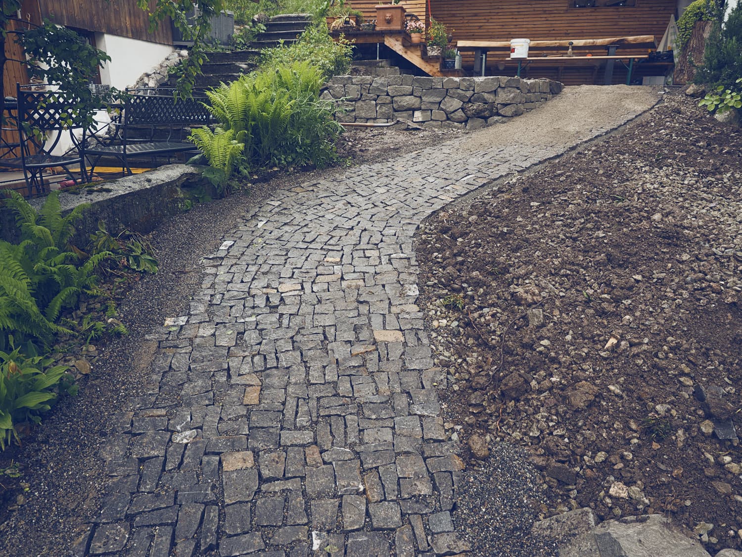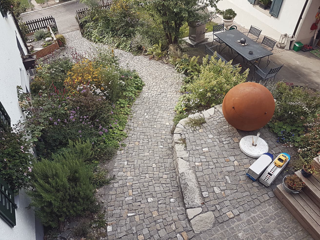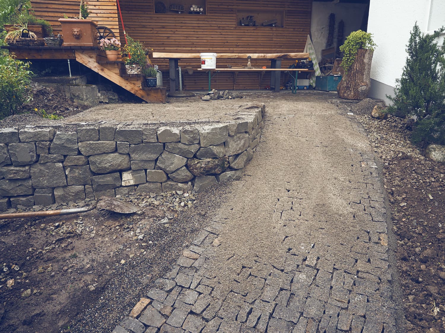 Entstanden ist ein geschwungener Weg aus Guber Pflastersteinen sowie eine Natursteinmauer aus Kuster Sandsteinen. Der Weg zum Hauseingang wurde in eine üppige Staudenbepflanzung eingebettet und macht diesen so zum Erlebnisweg. Die Pflanzen wurden in Anlehnung an die Umgebung und Nachbarschaft (Landwirtschaftsgebiet) ausgewählt.