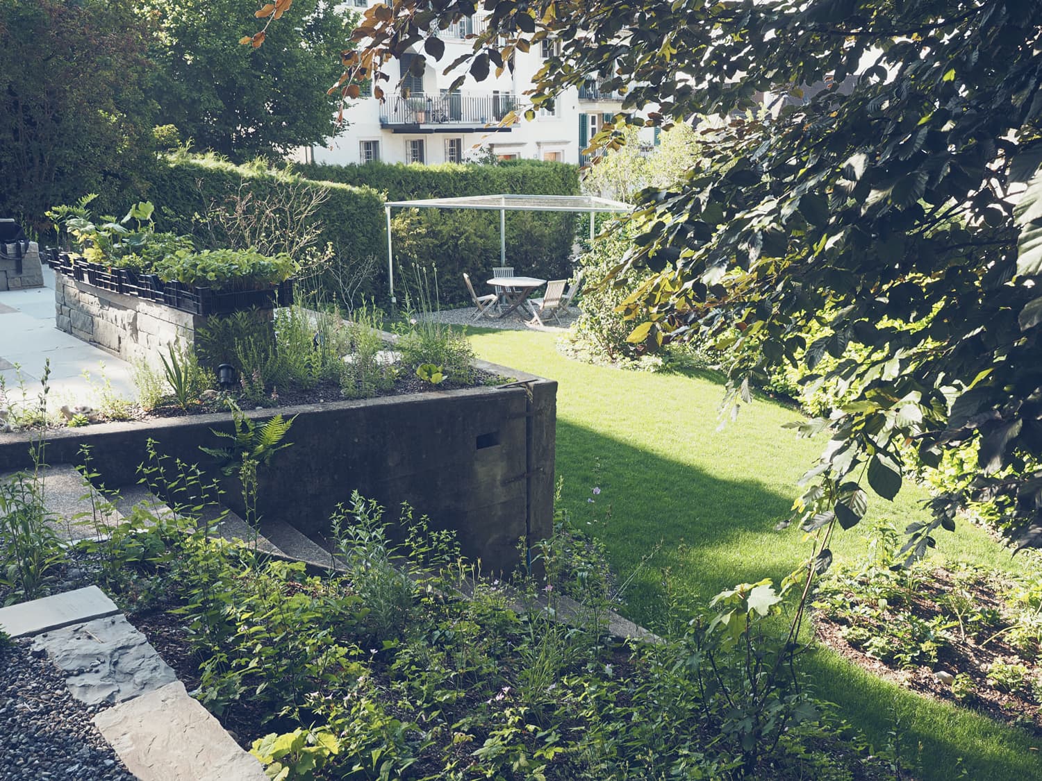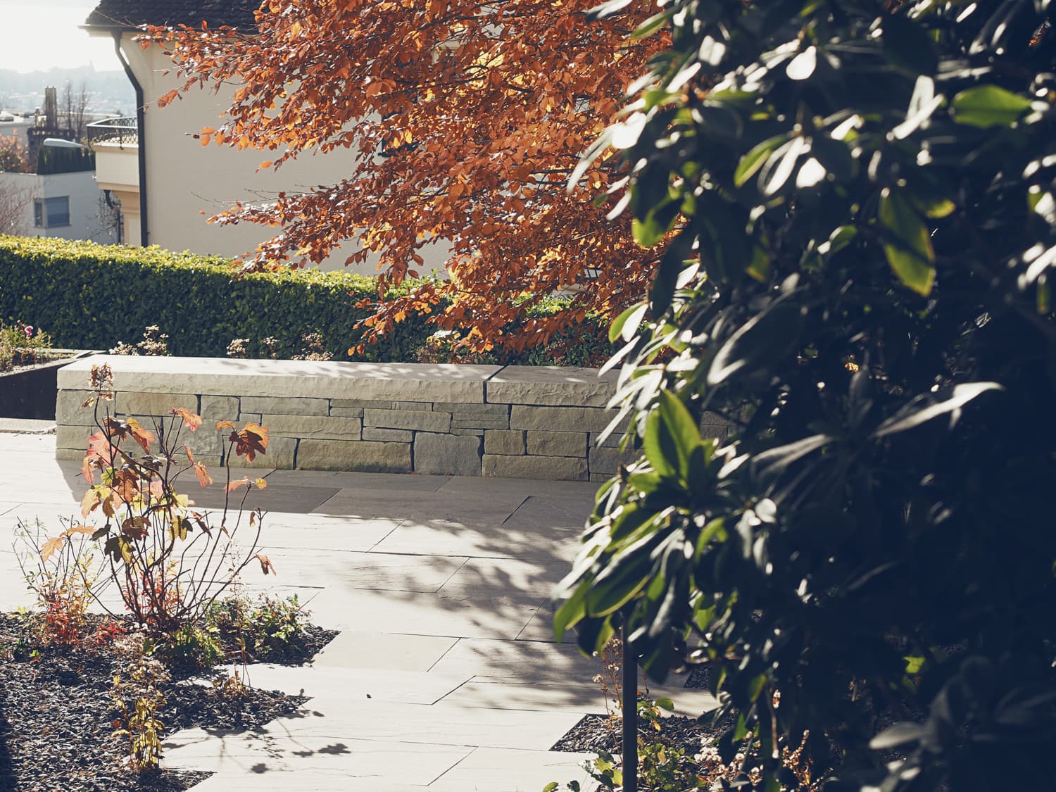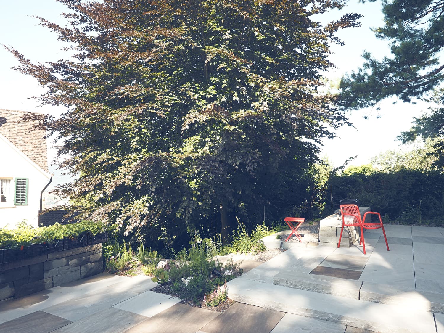 Die Grundstruktur des Gartens mit den Ebenen blieb erhalten. Mit grossformatigen Platten wurde die Terrasse am Haus neu gestaltet und vergrössert. Natursteinmauern zum Sitzen bilden den optischen Abschluss der Terrasse, die durch Staudenpflanzungen eingefasst ist. Im unteren Bereich wurde die Rasenfläche geebnet, mit attraktiven Pflanzungen ergänzt und ein weiterer Sitzplatz unter einer Pergola geschaffen.