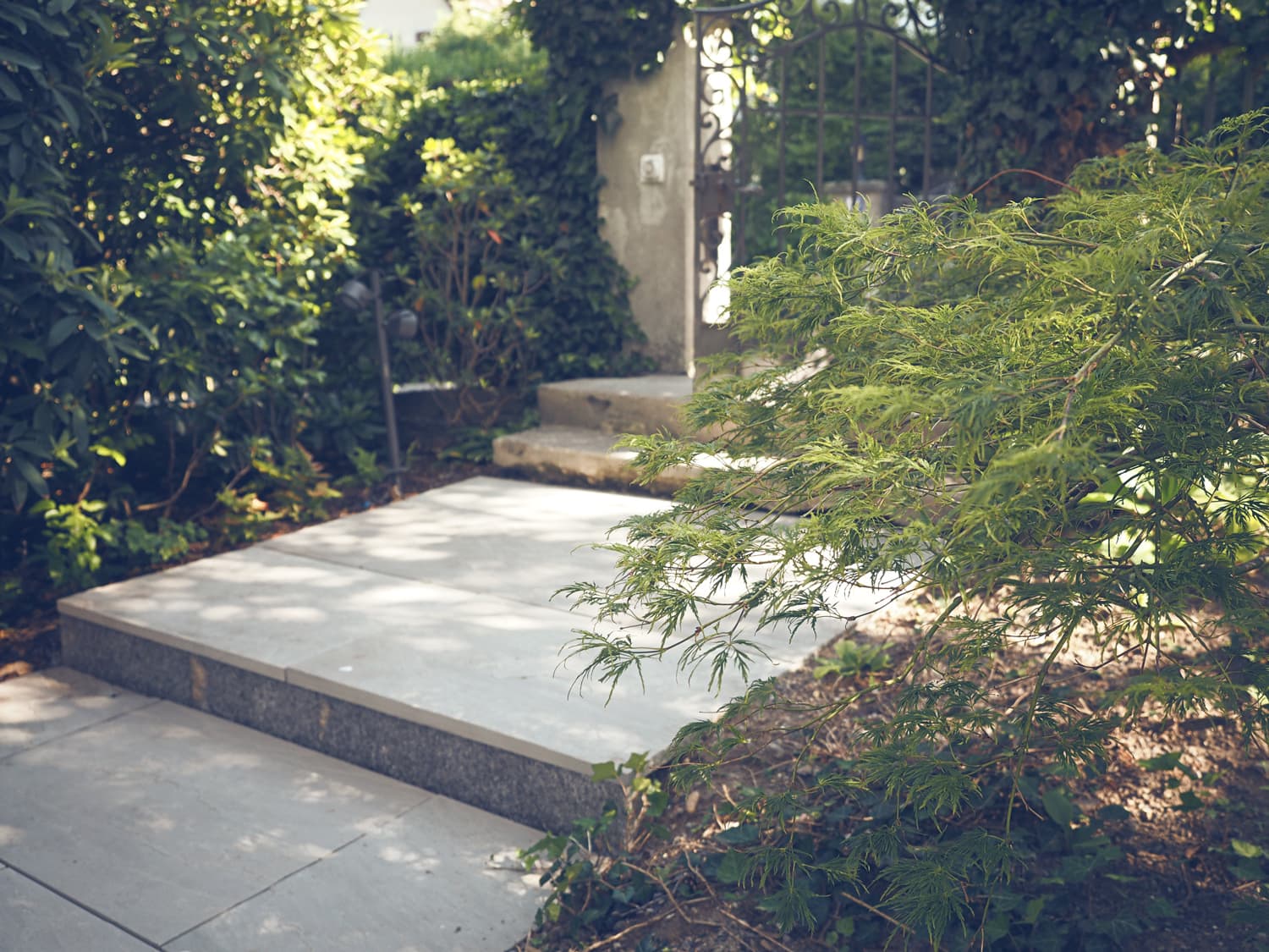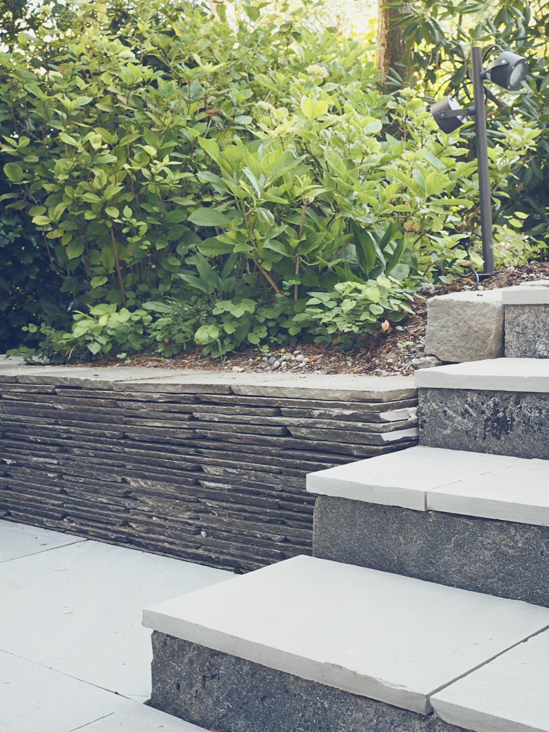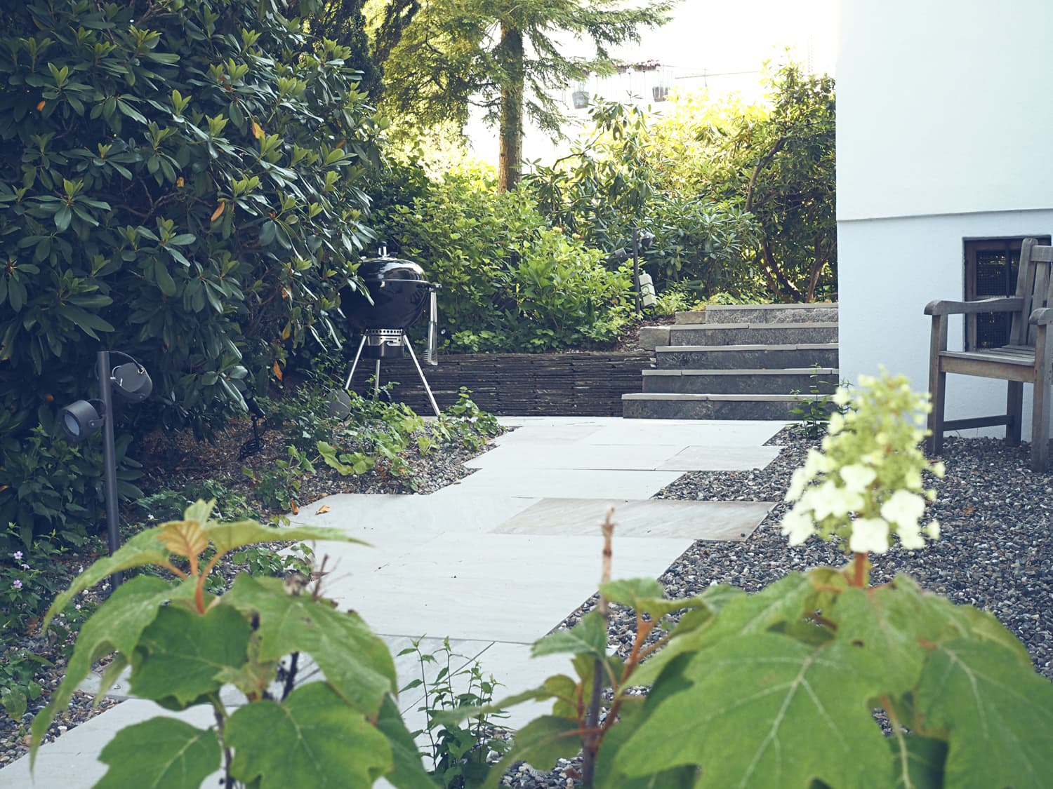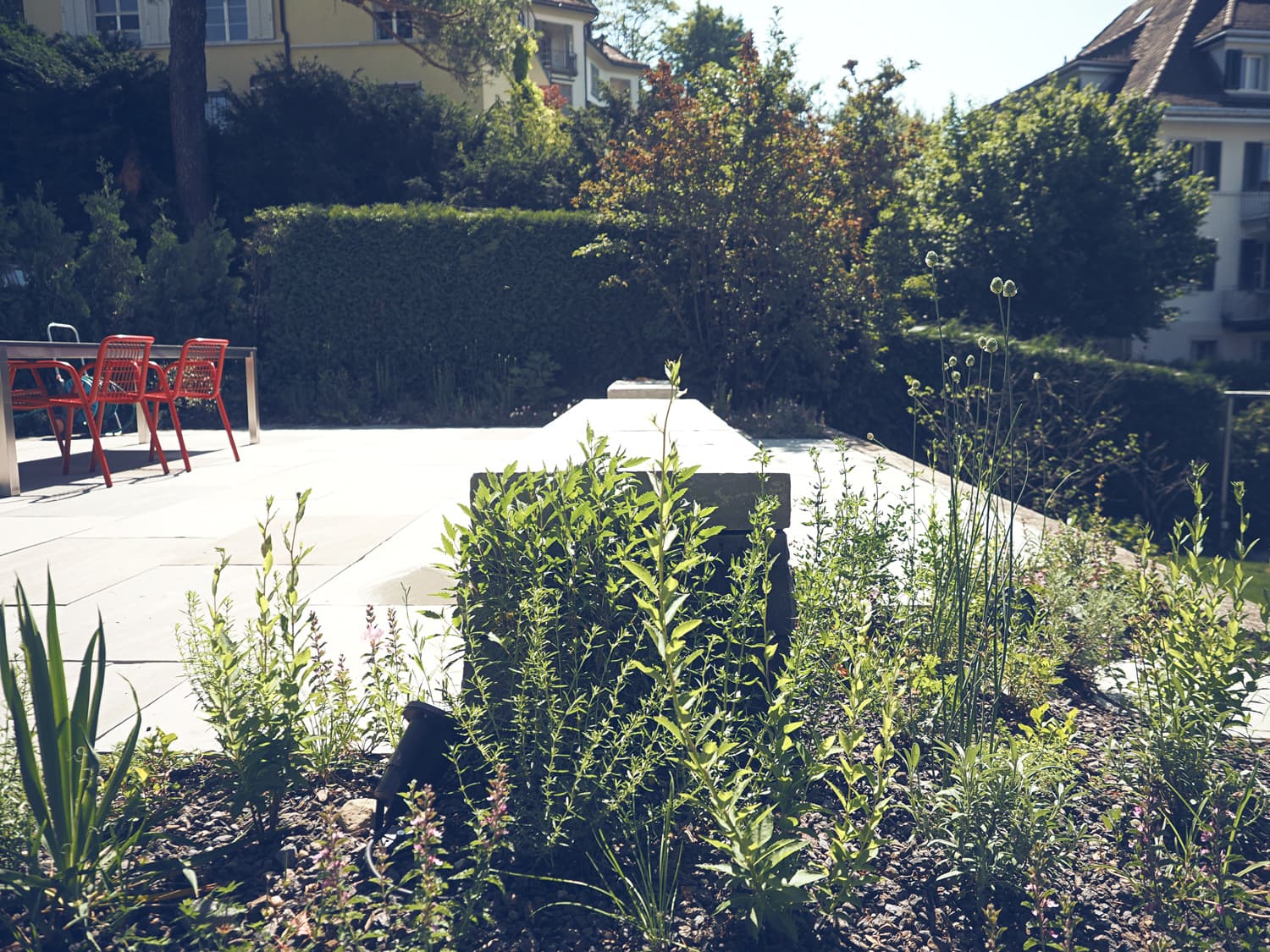 Die Grundstruktur des Gartens mit den Ebenen blieb erhalten. Mit grossformatigen Platten wurde die Terrasse am Haus neu gestaltet und vergrössert. Natursteinmauern zum Sitzen bilden den optischen Abschluss der Terrasse, die durch Staudenpflanzungen eingefasst ist. Im unteren Bereich wurde die Rasenfläche geebnet, mit attraktiven Pflanzungen ergänzt und ein weiterer Sitzplatz unter einer Pergola geschaffen.