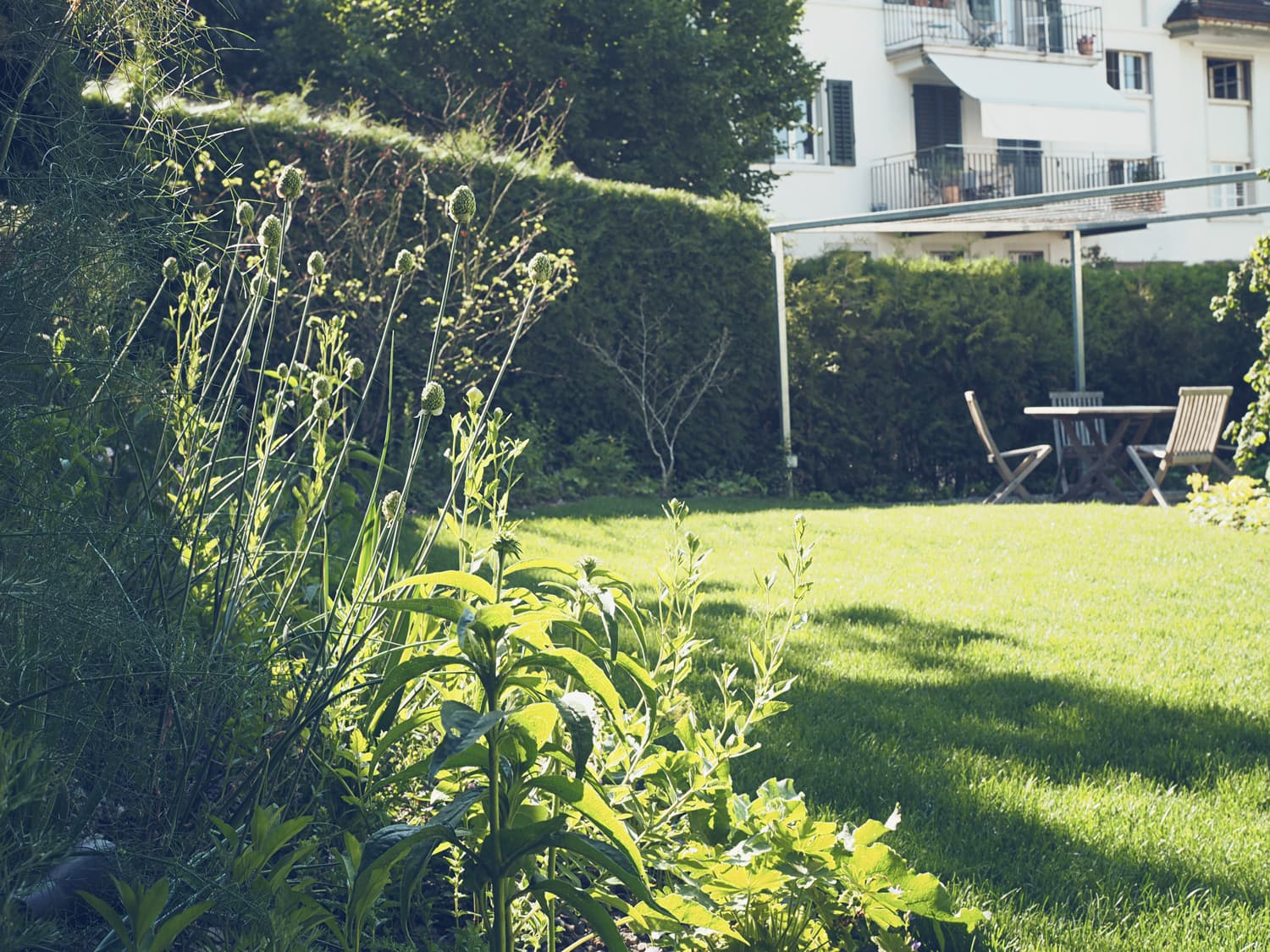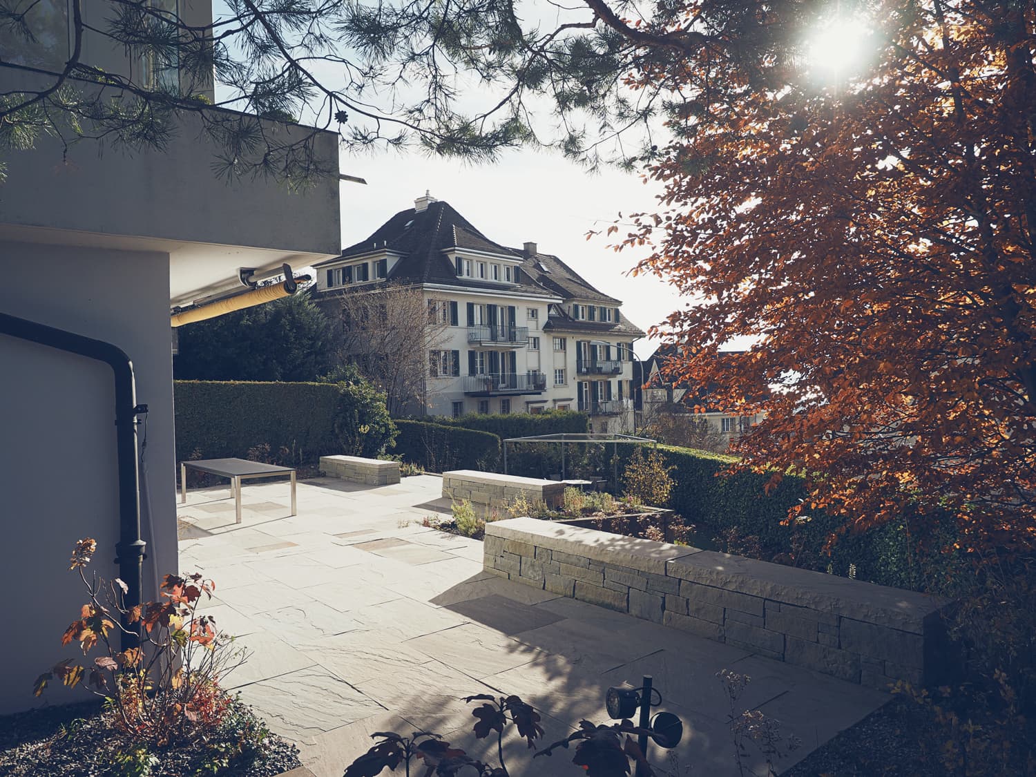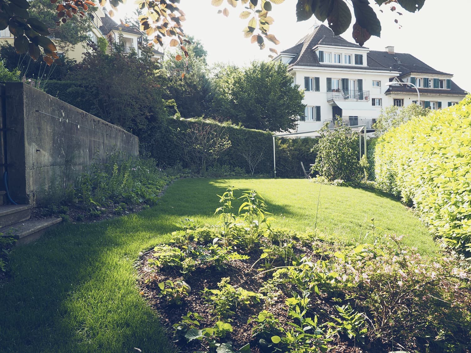 Der in die Jahre gekommene Garten am Zürichberg soll aufgewertet werden. Auf zwei Ebenen erstrecken sich eine Terrasse und eine Rasenfläche. Der Belag ist brüchig geworden und die Bepflanzung vernachlässigt. Die Familie hält sich sehr gerne in ihrem Garten auf und möchte mit grosszügigen Sitzbereichen und einer abwechslungsreichen Bepflanzung wieder mehr Freude daran haben.