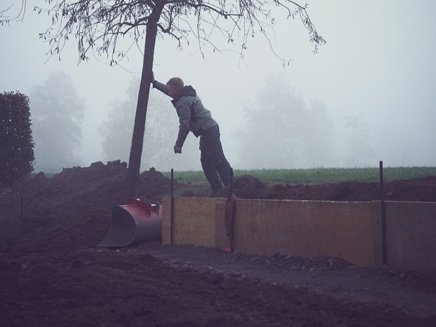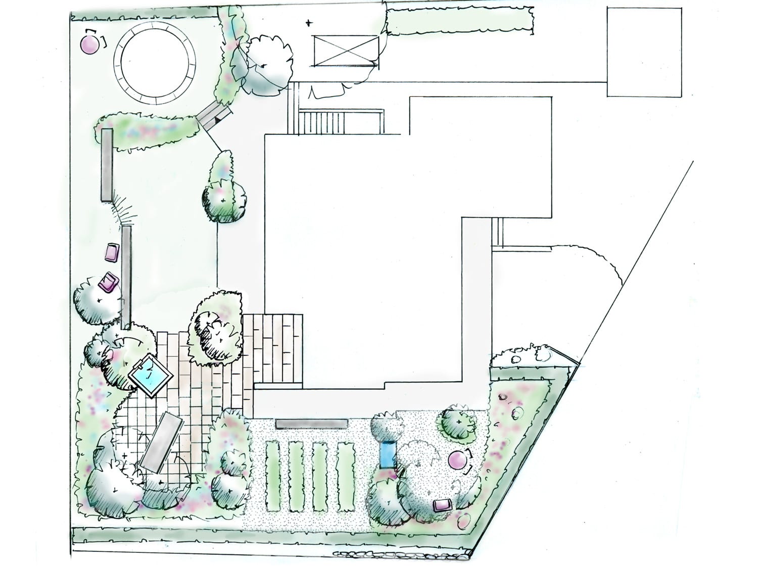 Drei gerade Natursteinmauern terrassieren das Gelände und geben der weichen Gestaltung den nötigen Halt und Struktur. Der Grosse Sitzplatz wurde im Ecken so angelegt, dass ein Blick über den Ganzen garten möglich. Ein Grosser Natursteinbrunnen wurde diagonal angeordnet und steht als Gestaltungselement für sich alleine. Die Abgrenzungen erfolgen mit erhöhten Pflanzinseln, welche mit Solitärpflanzen und Stauden bepflanzt werden. Der erhöhte Trampolinplatz kann später als Sitzplatz genutzt werden und der kleinere Sitzplatz in Nordwesten ist ein idyllischer Ort zur Erholung im Grünen, unter Bäumen in der Abendsonne.