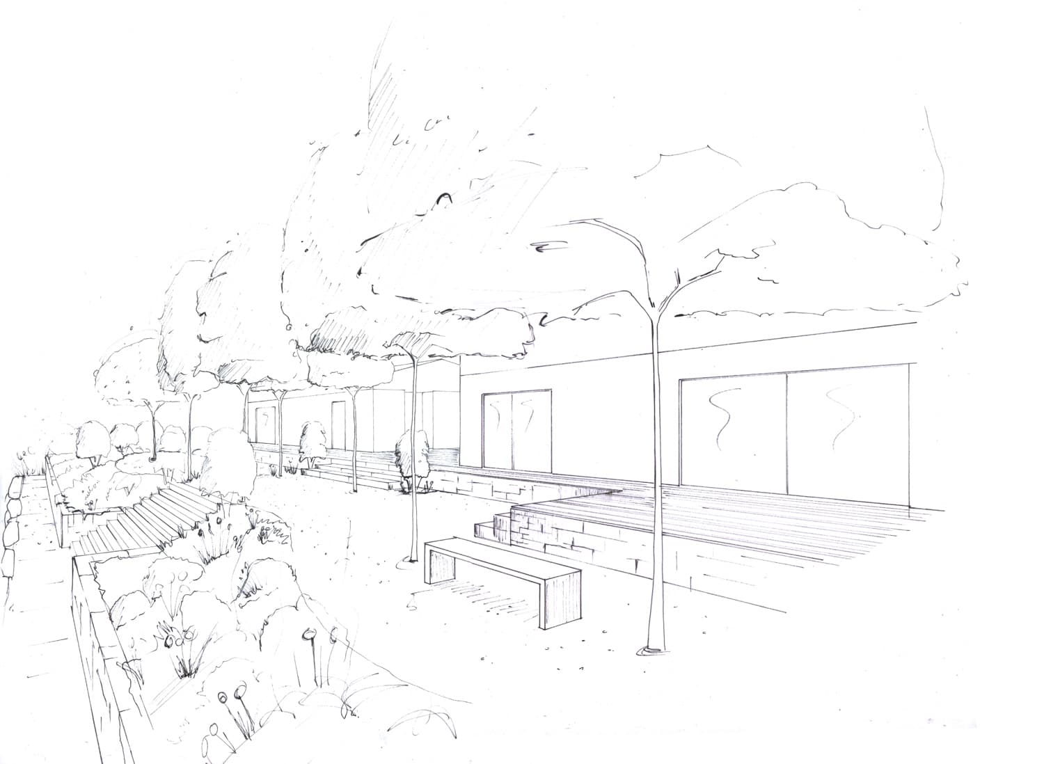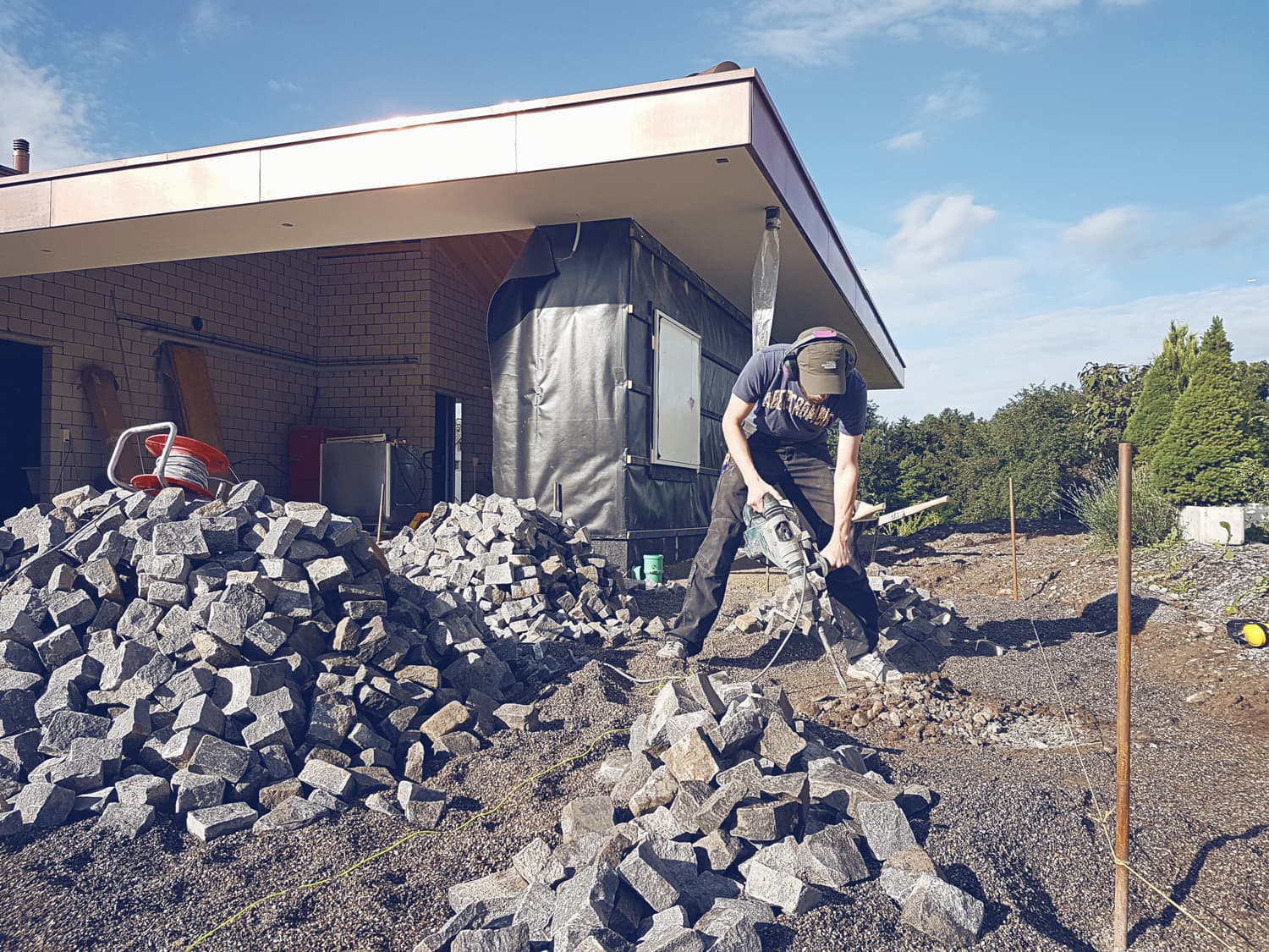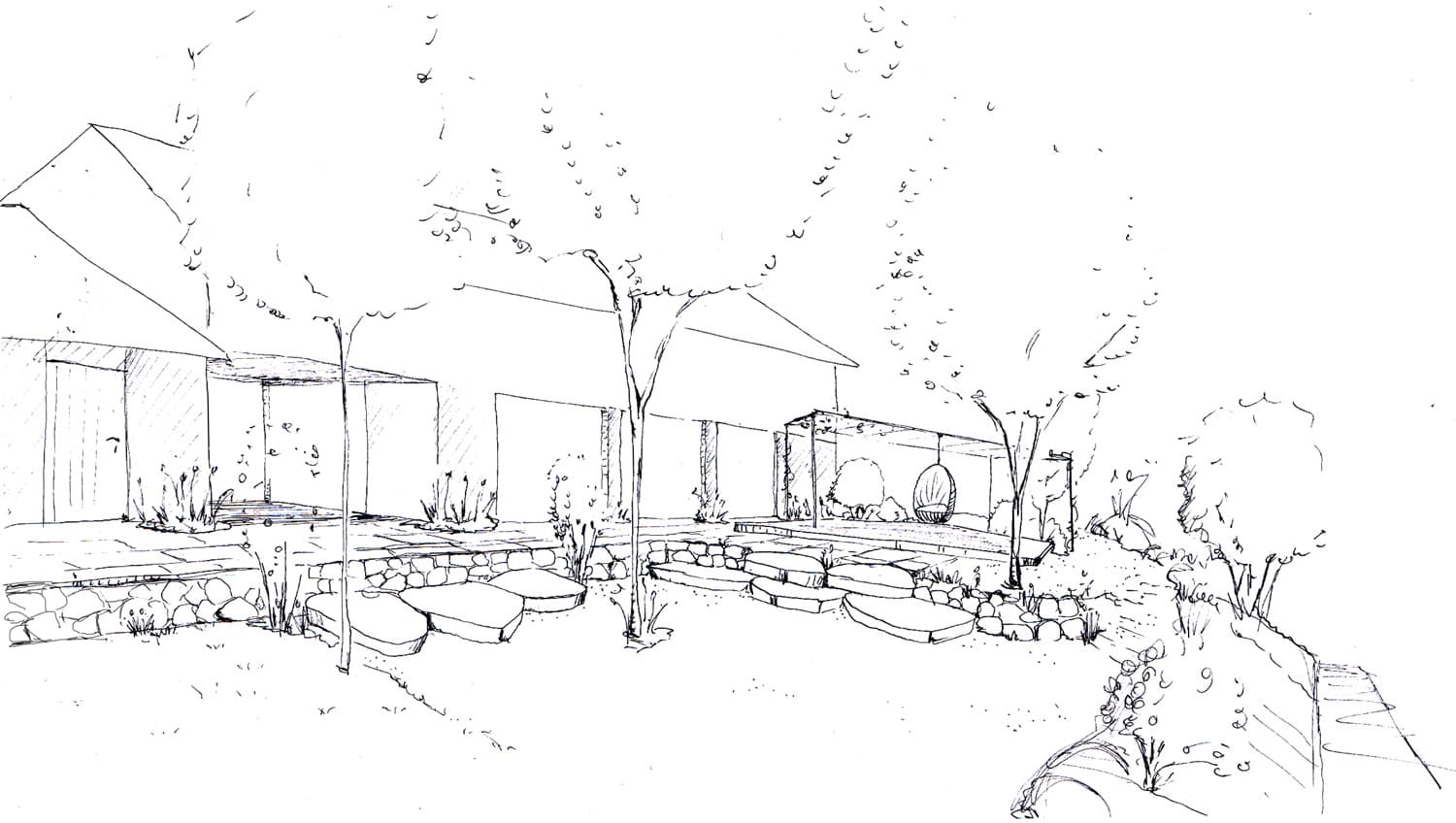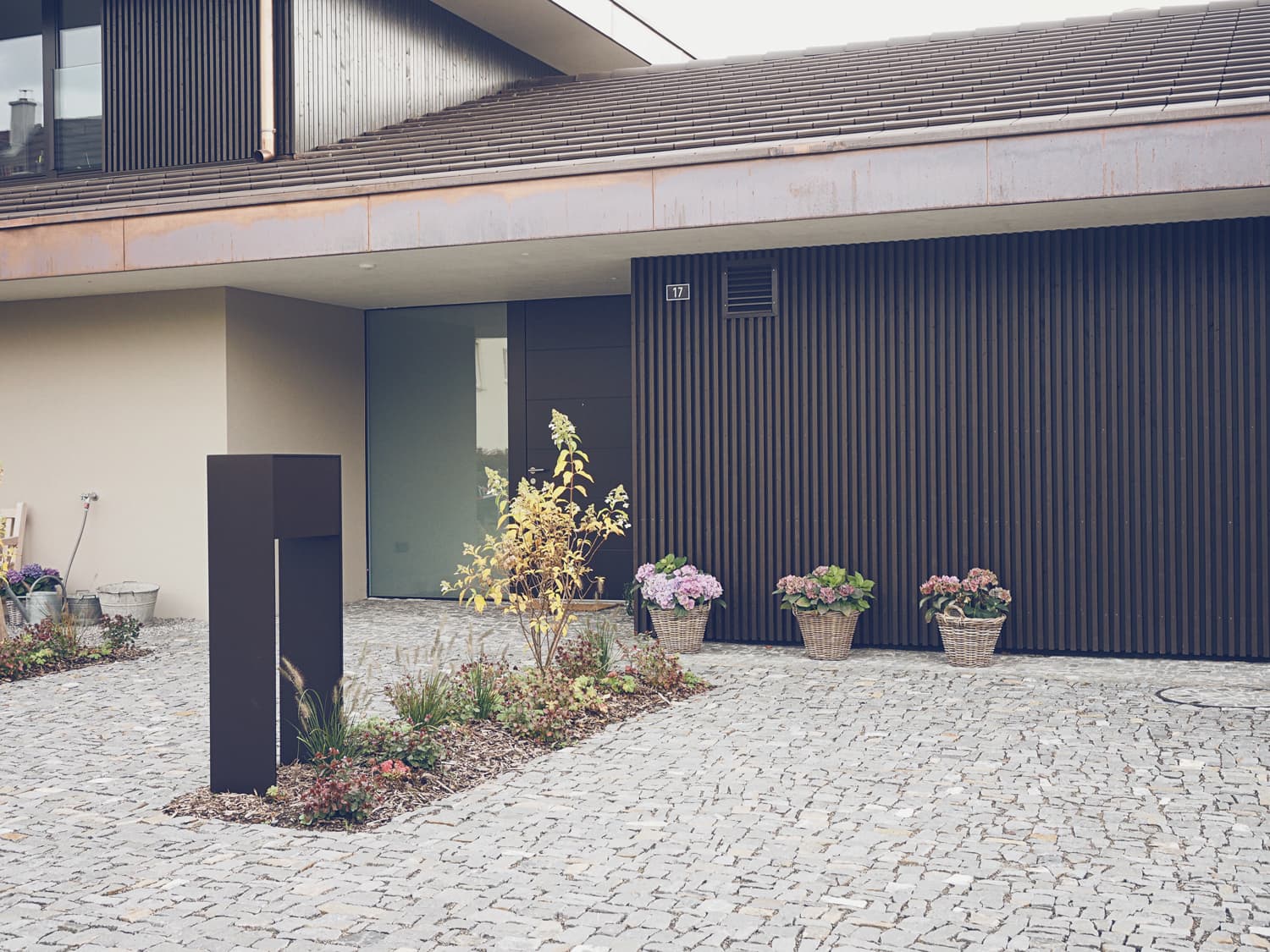 Das Einfamilienhaus wurde auf einer Erhöhung mit Blick in die Ferne gebaut. Der Wunsch: ein Garten unter dem Motto „Outdoor Living“. Die Elemente sollen natürlich und modern sein, naturnah und durch klare Linien ergänzt werden.