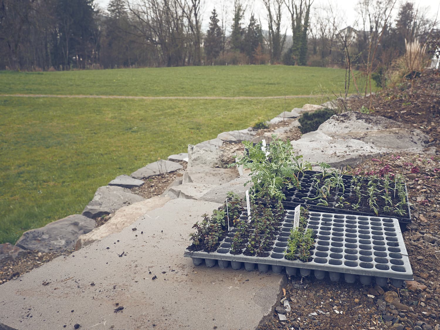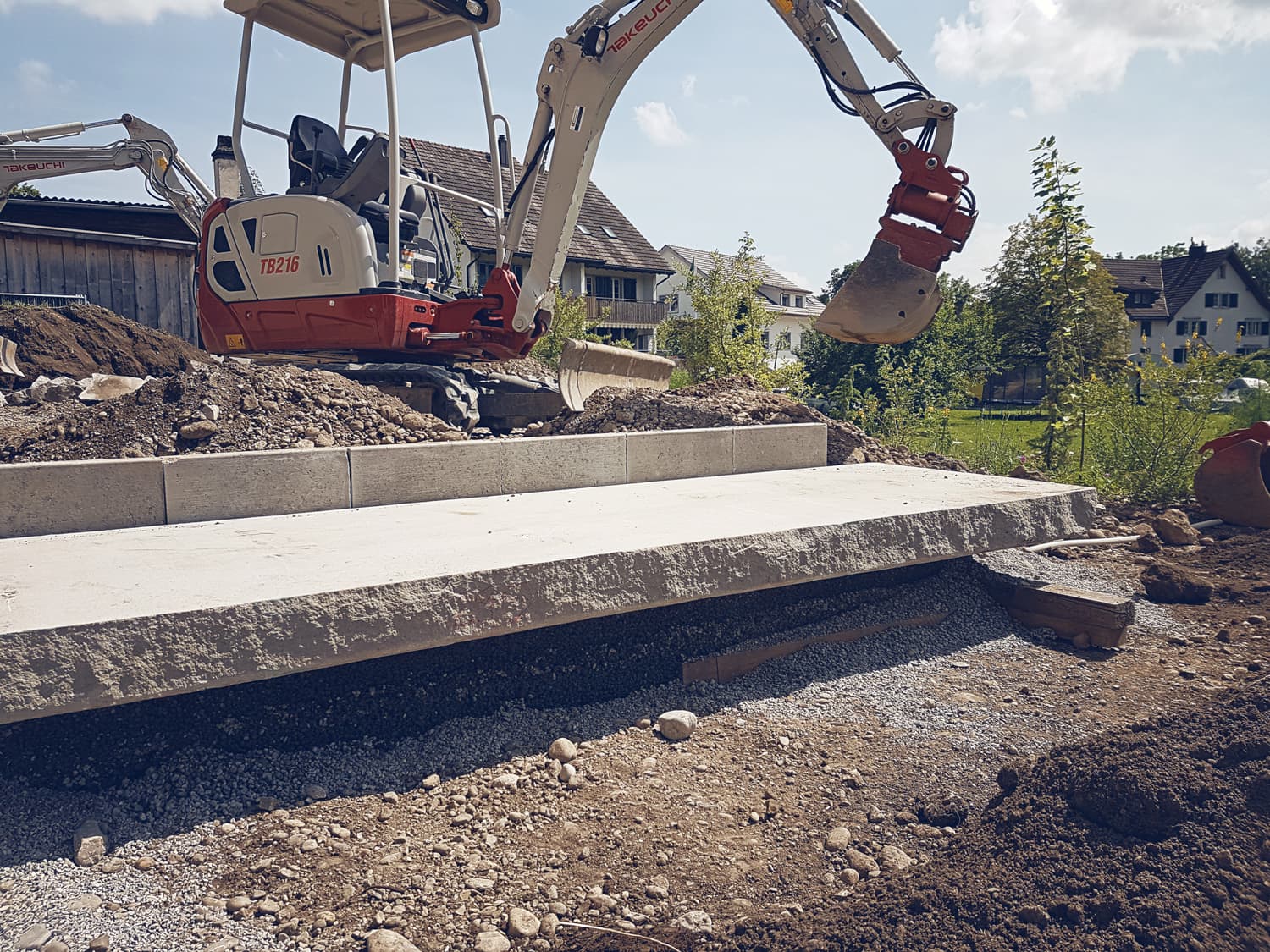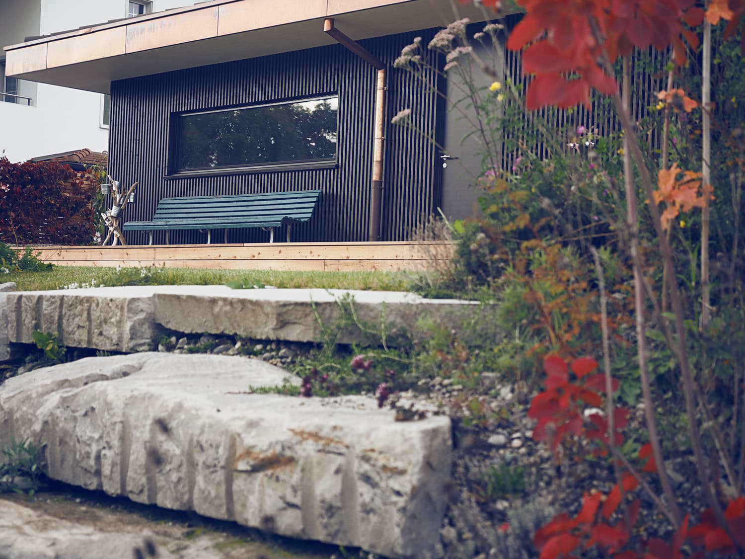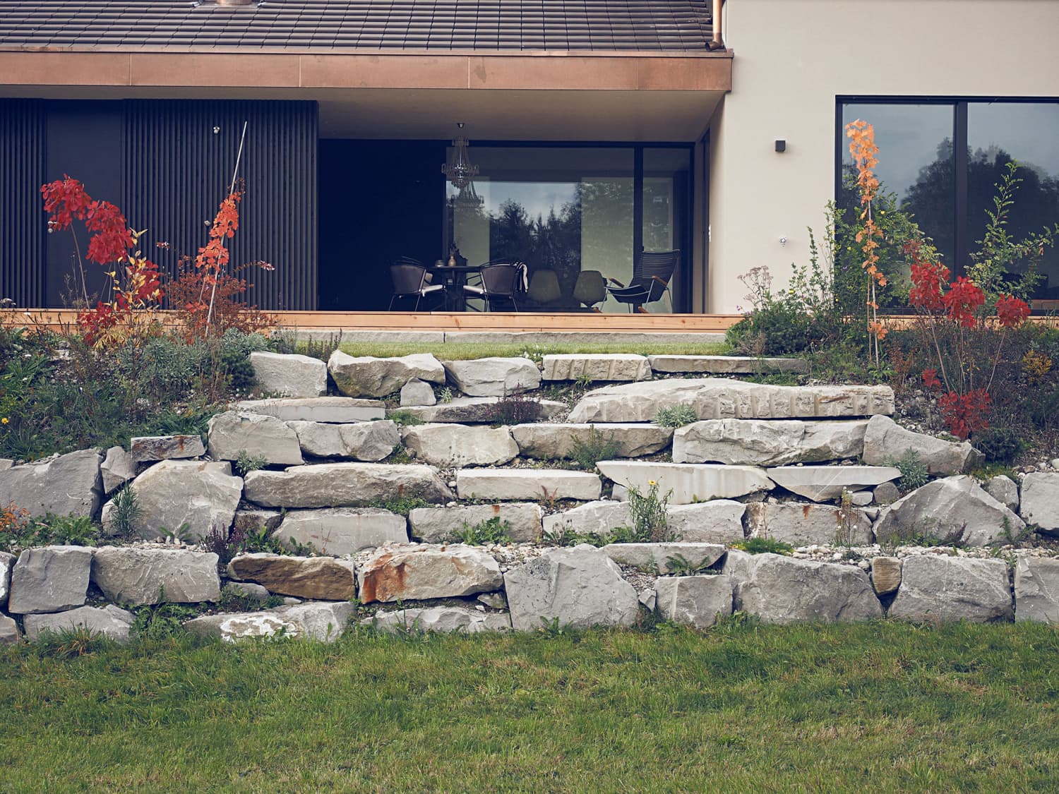 Der nach Süden ausgerichtete Garten wurde in drei Bereiche unterteilt. In Hausnähe wurde ein 100 m2 grosses Holzdeck mit klaren Linien realisiert und dient nun dem Hauptaufenthalt. Der zweite Bereich wurde um 45cm abgesetzt und bietet ein grosser Rasen zum Spielen und „sünnele“. Dieser Bereich hat die Verbindung zwischen dem Formalen und Natürlichen hergestellt. Der dritte Bereich wurde in der Böschung mit Natursteinmauern und Pflanzen umgesetzt. Hier kann der Benutzer weg vom Haus die Idylle der Landschaft geniessen.