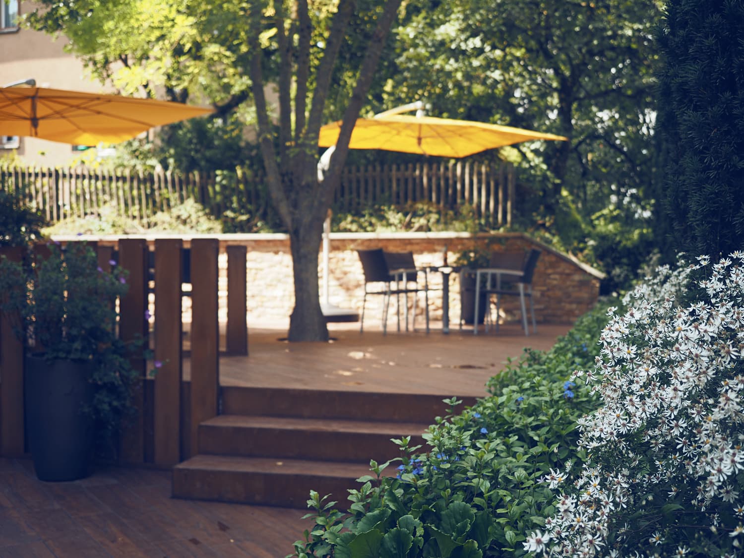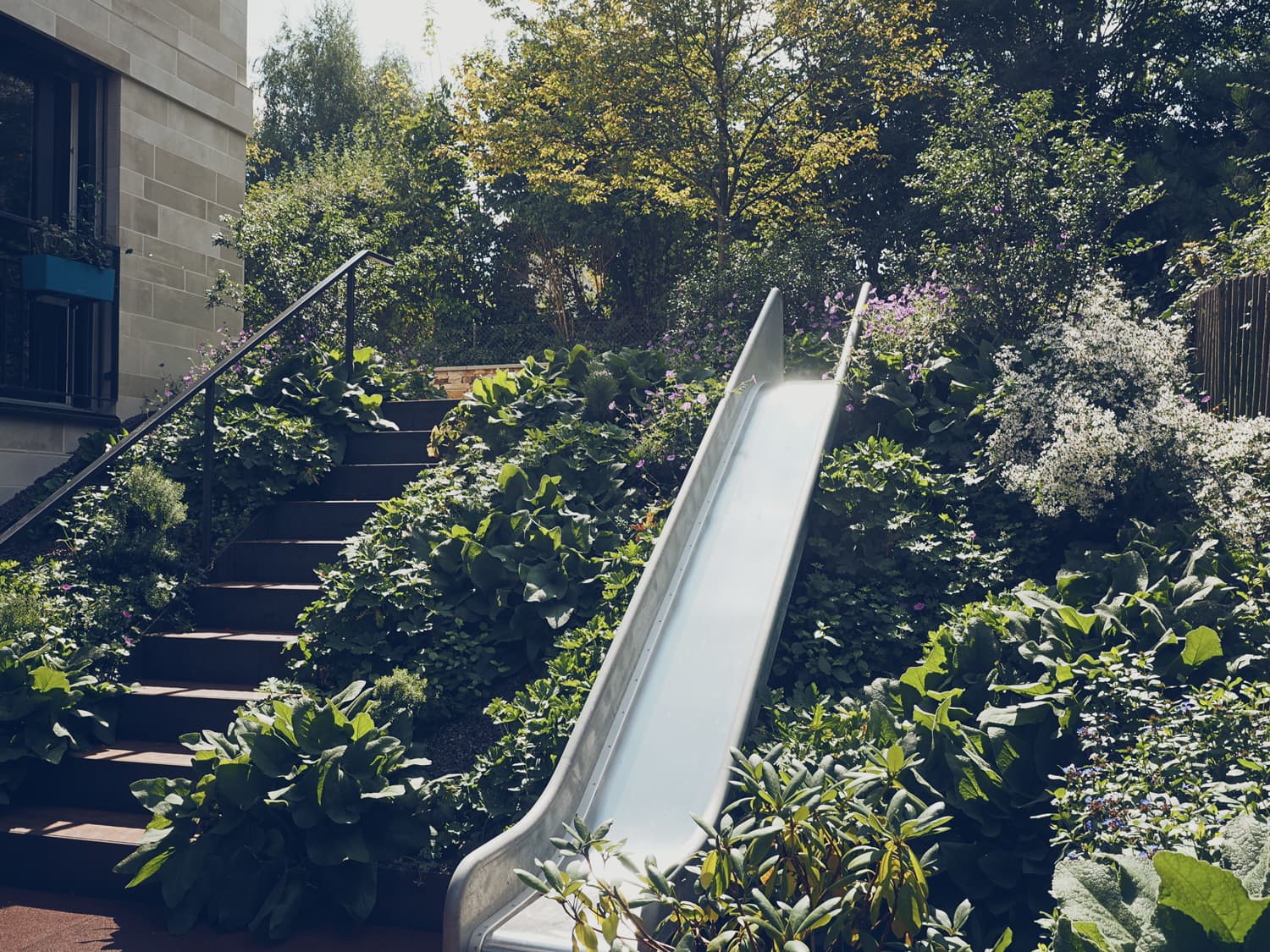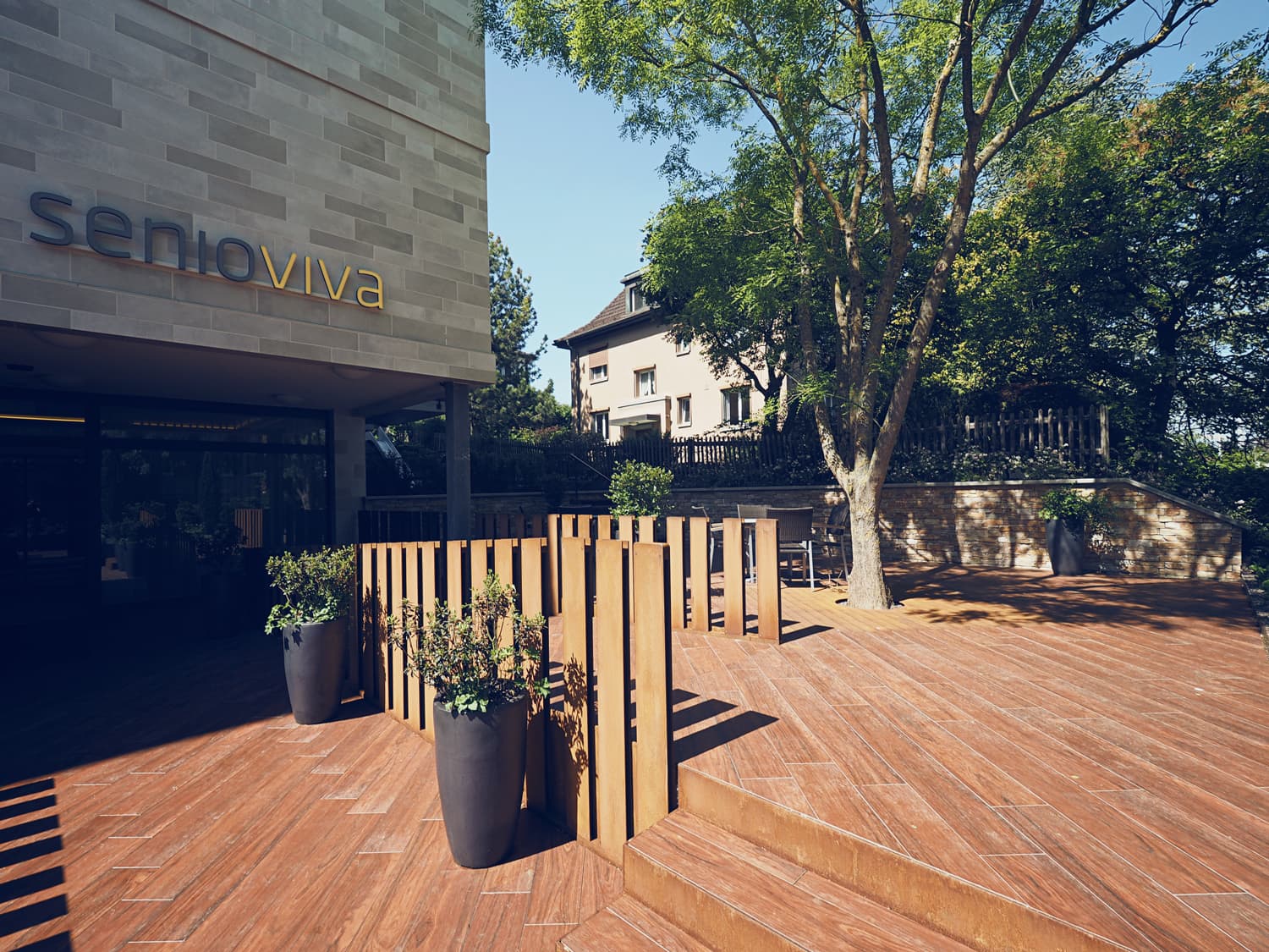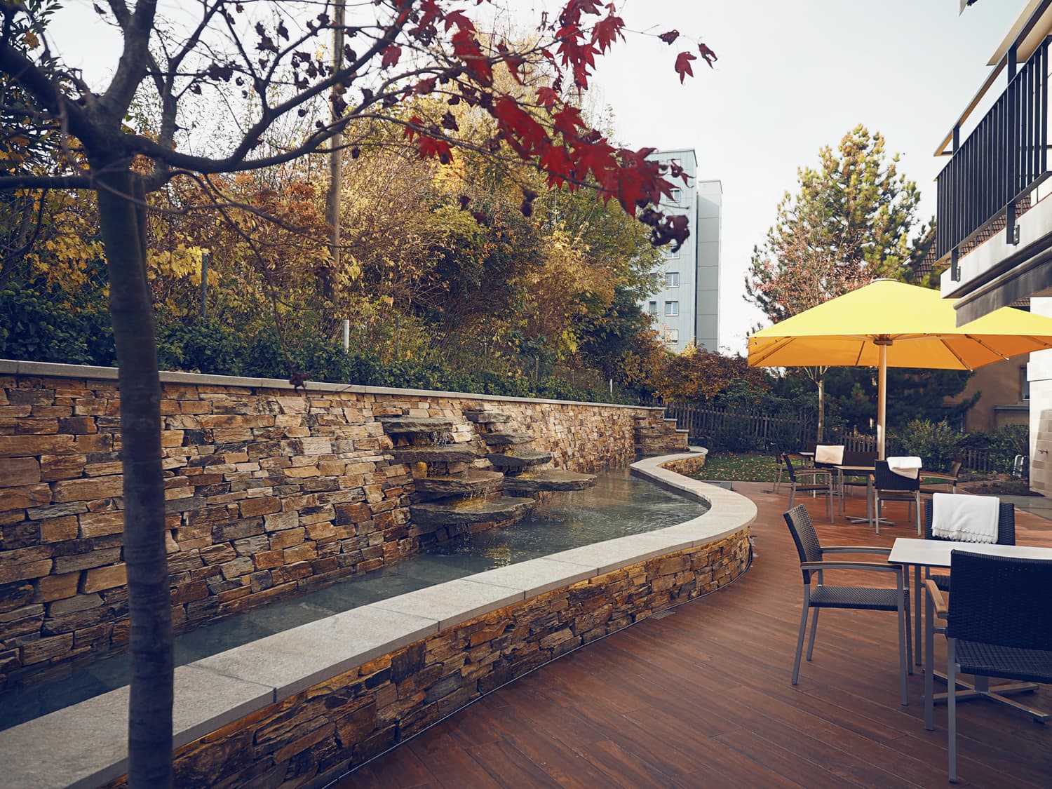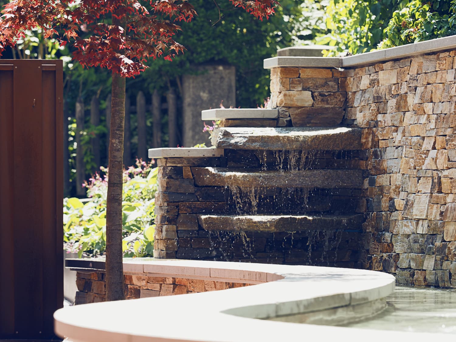 Auf der Südseite wurde ein Riesenbrunnen mit Kaskadensteinen gestaltet. Wie ein kleiner Wasserfall plätschert das Wasser über die Steine in das geschwungene, 30 Meter lange Becken. Das Highlight im Eingangsbereich sind Metallstehlen welche in der Nacht von innen heraus leuchten. Die Natursteinmauern werden alle indirekt von den Abdeckplatten aus nach unten beleuchtet.