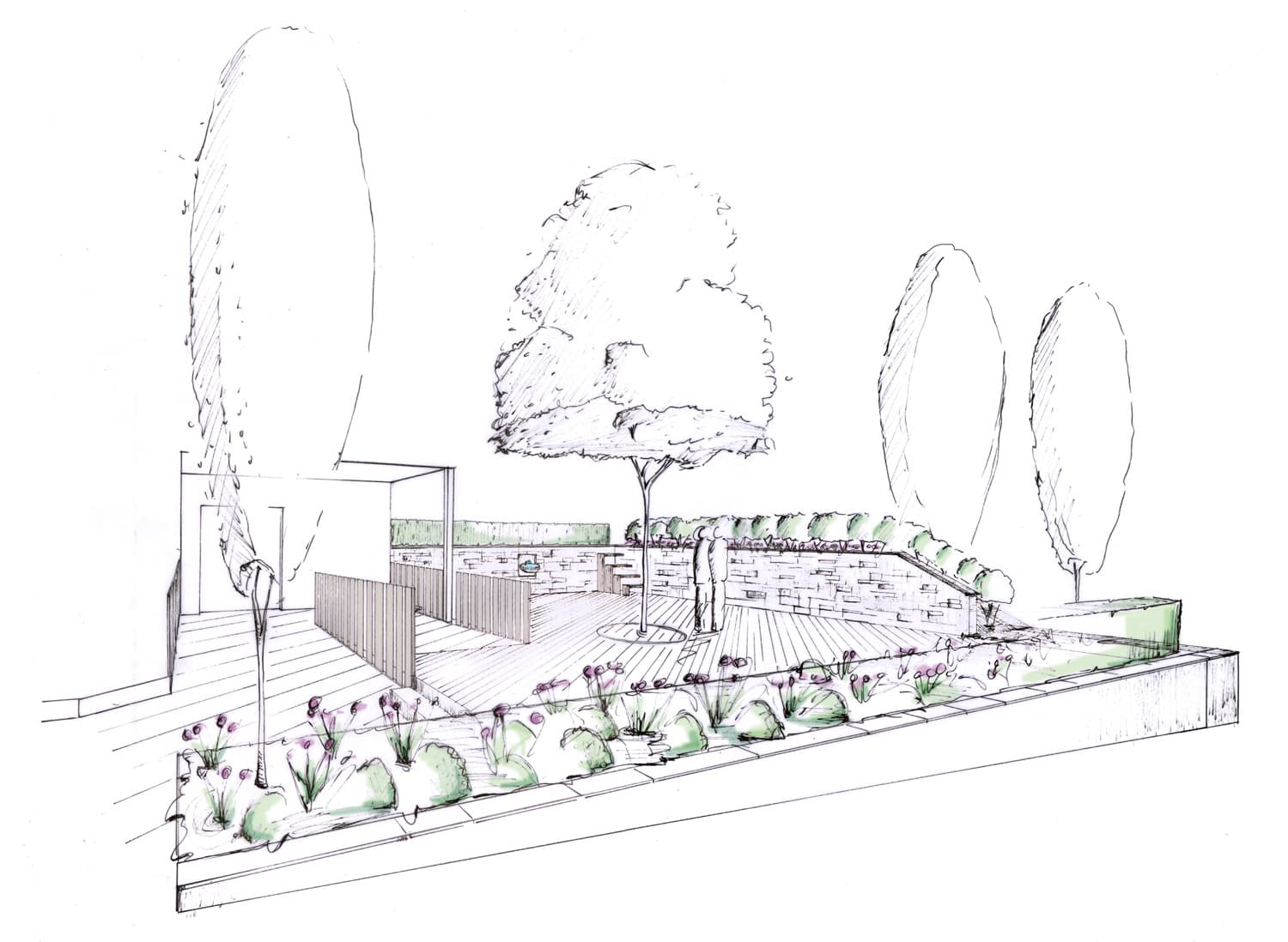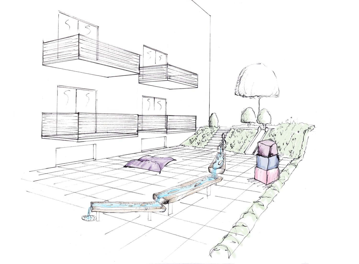 Der Neubau an Hanglage soll einzigartig werden. Wasserelement, grosse Bäume und eine schöne Beleuchtung sind zentrale Wünsche der Bauherrschaft. Nichts soll „normal“ sein, Detailgestaltung und Speziallösungen sind wichtig.