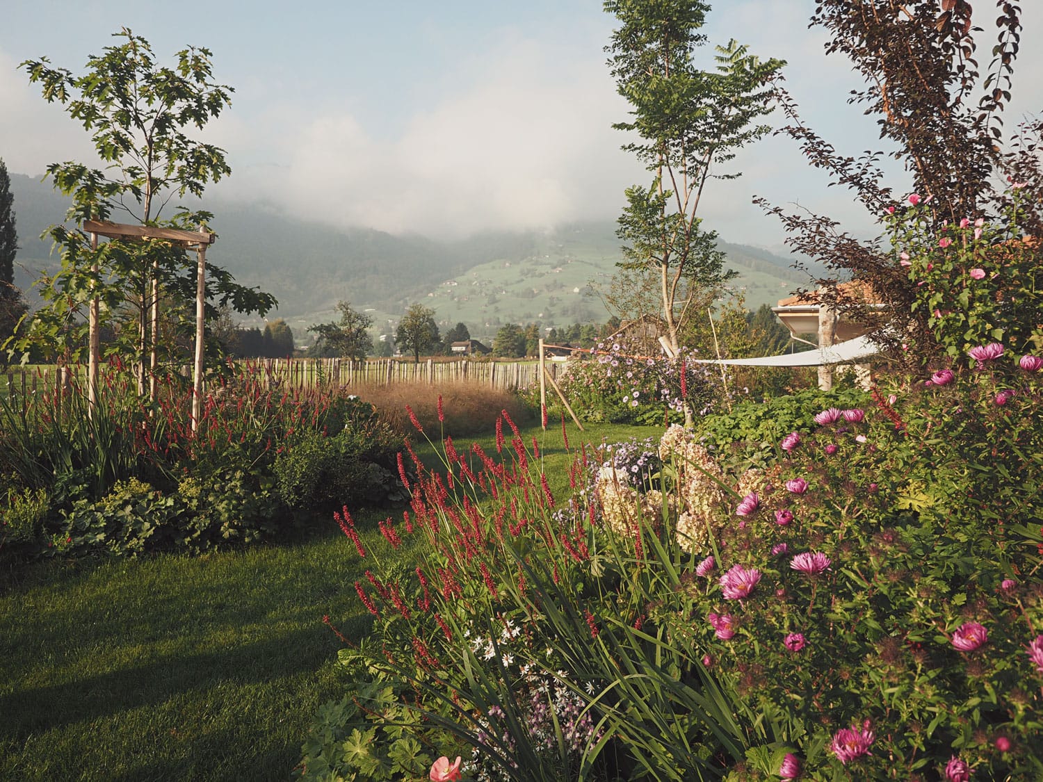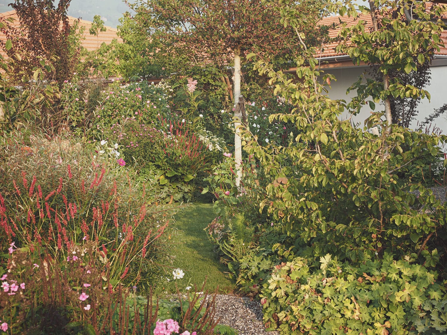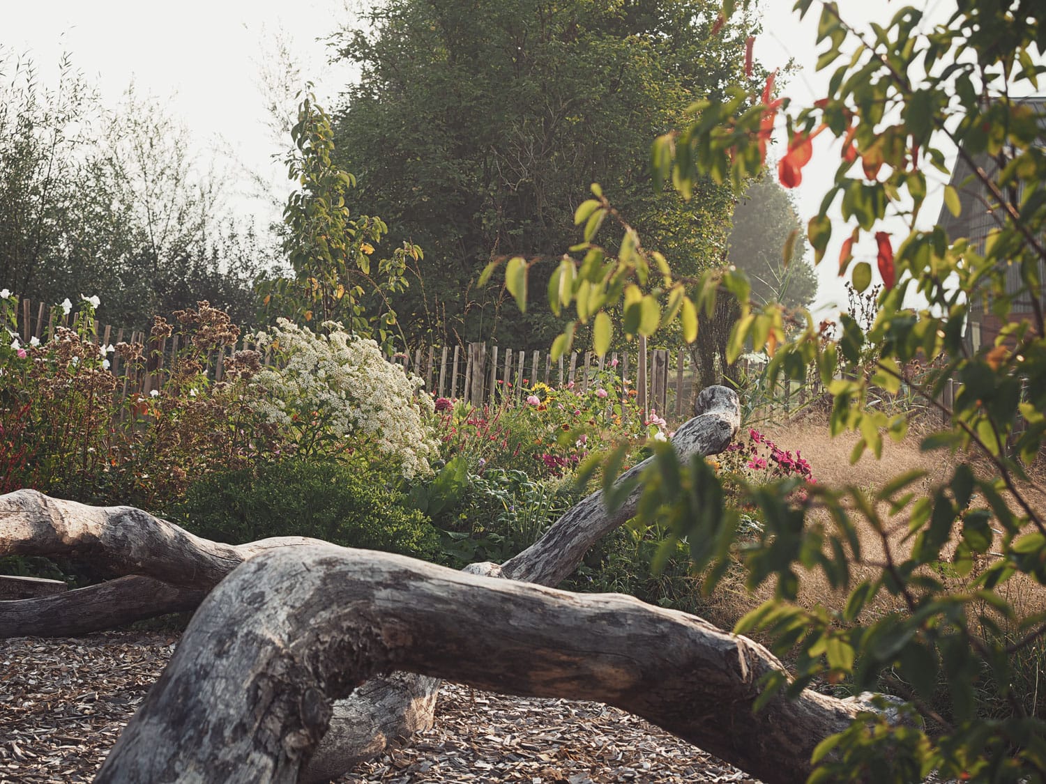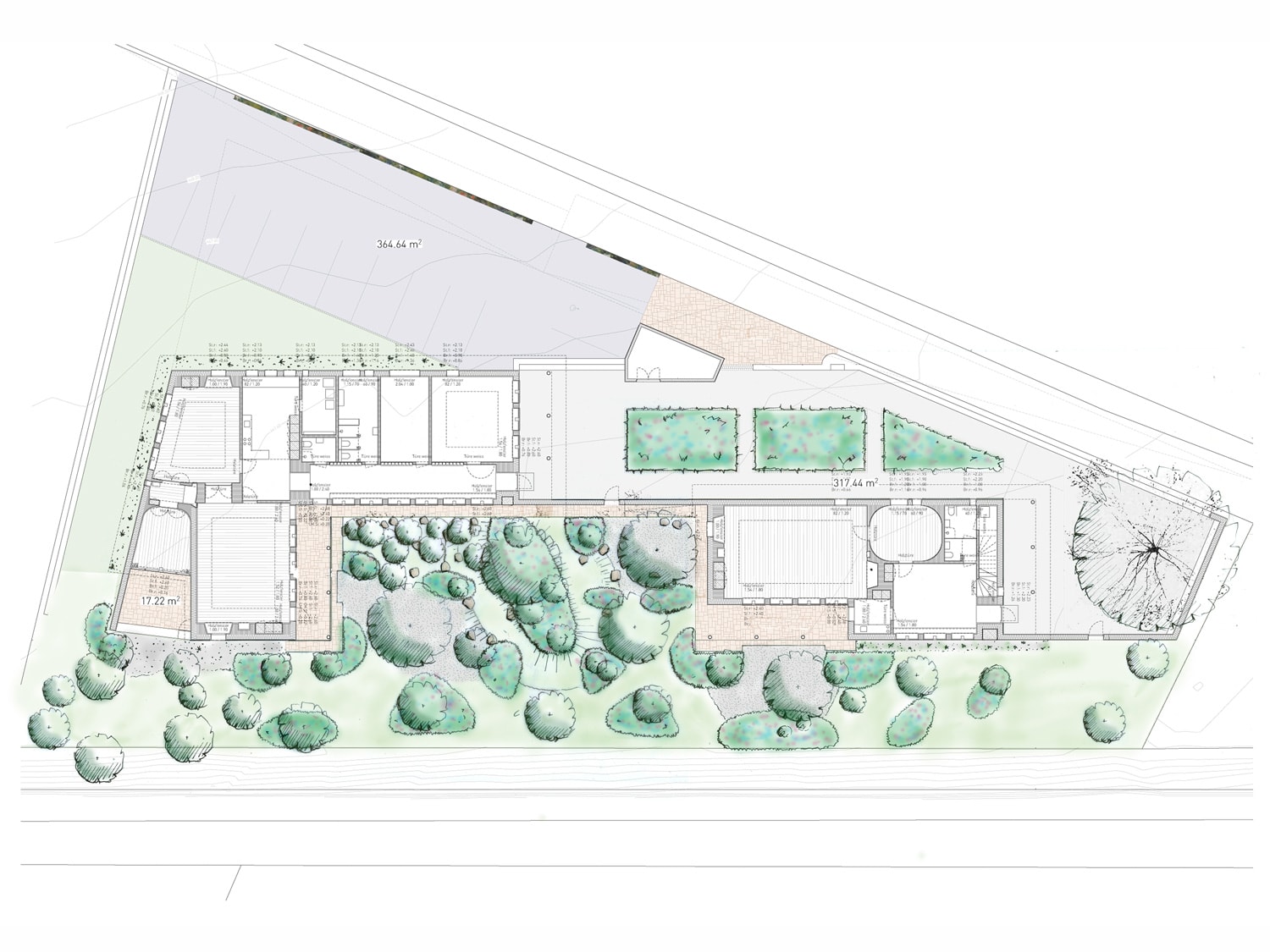 Die Formen sind dynamisch, das Terrain hügelig und weich. Das Terrain ist hügelig und verschiedene Pflanzflächen mit Stauden, Sträuchern und Bäumen durchmischt. Darin werden sich die Kinder Ihre eigenen Verstecken und Lieblingspfade bauen und suchen. Die Wildblumenwiese wird je nach bedarf Flächig gemäht oder auch mit Wegen versehen.