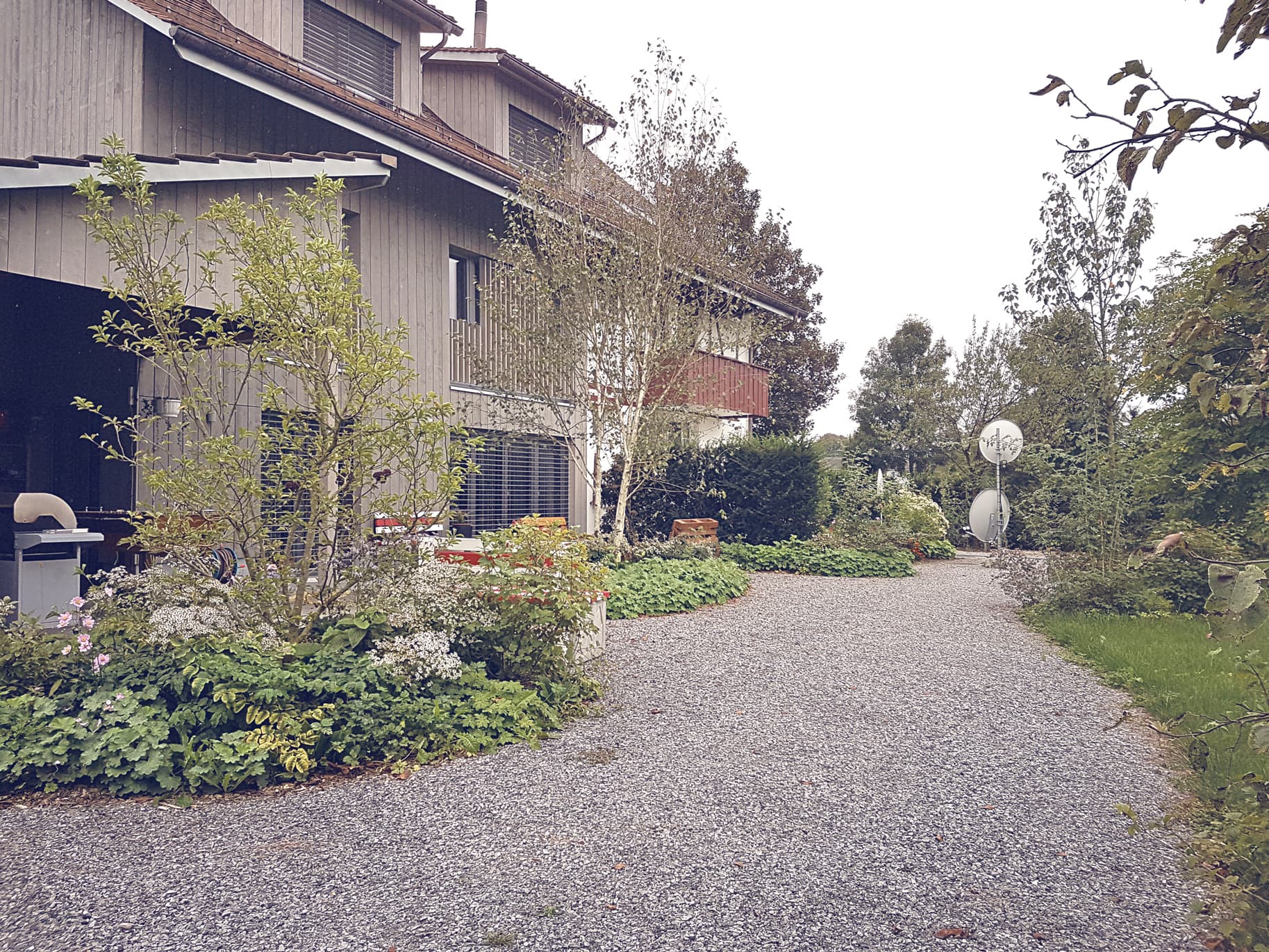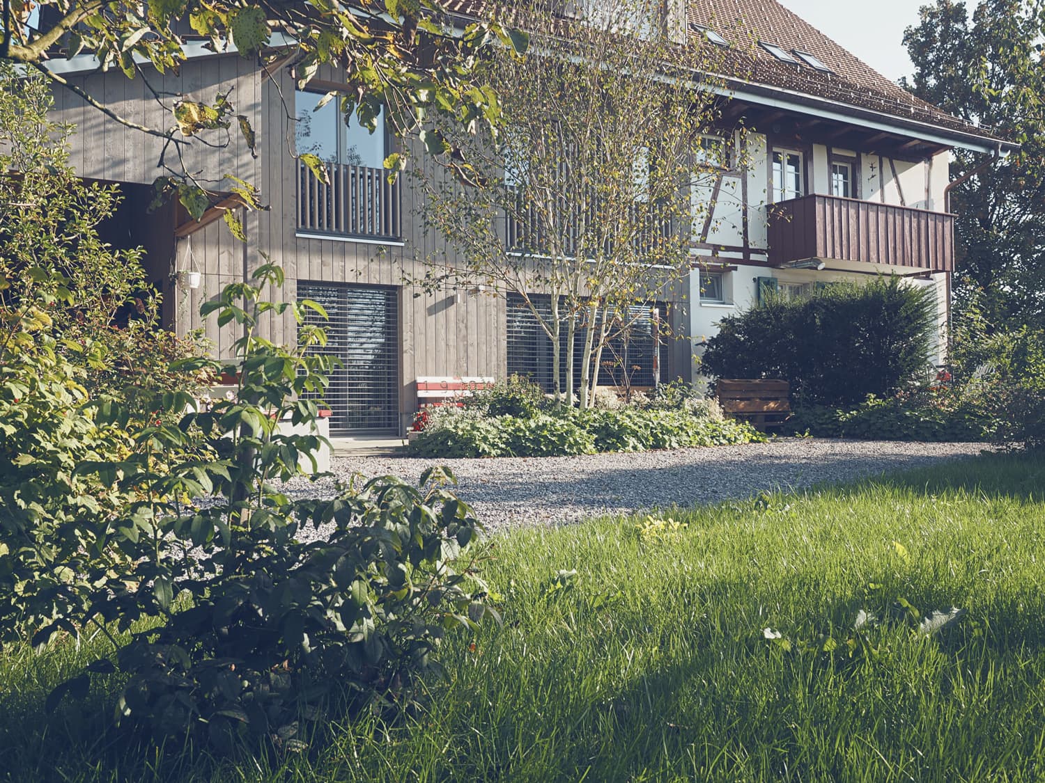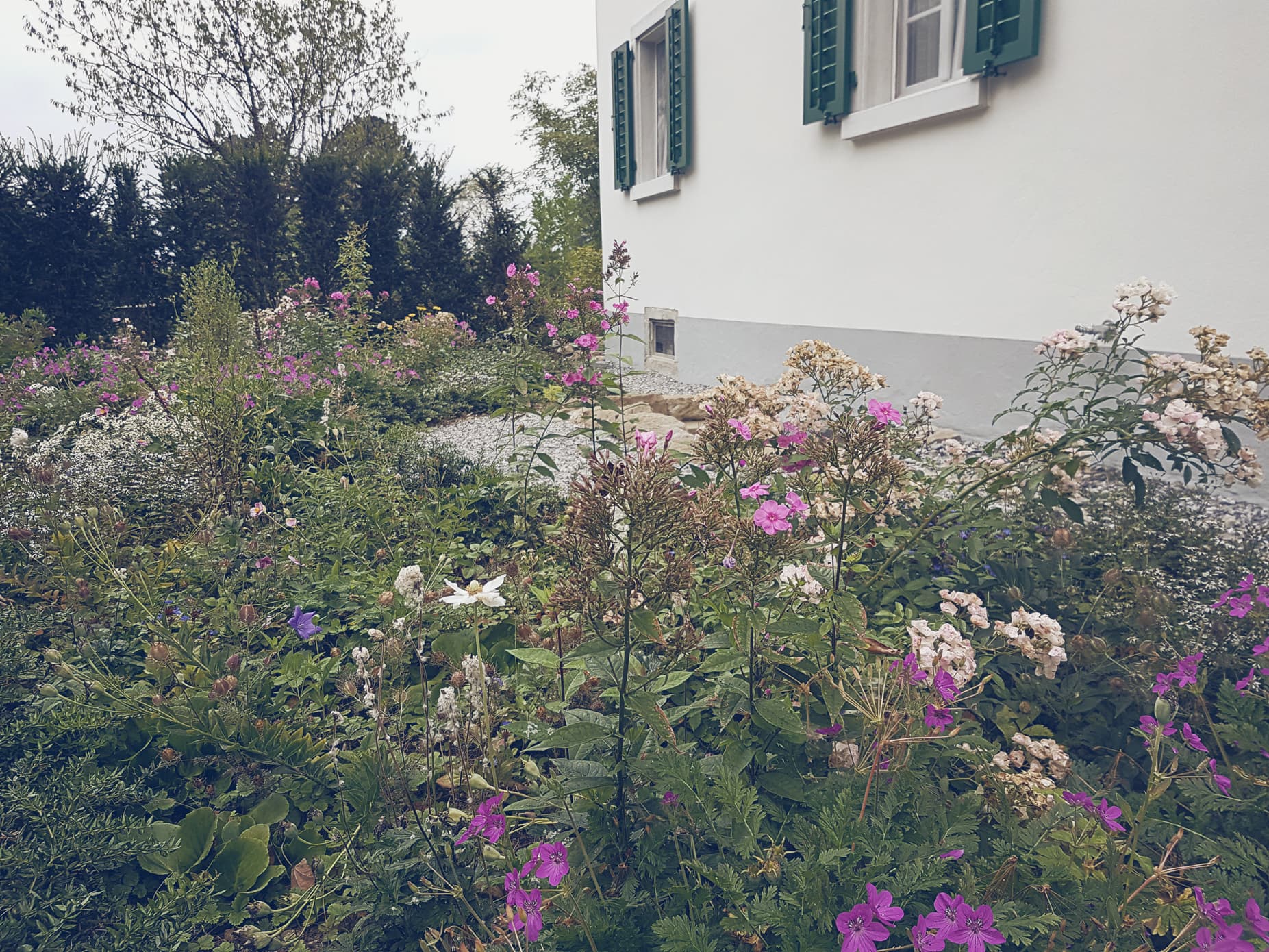 Im Eingangsbereich wurden die Blumenbeete mit Kleinhecken eingefasst und sollen so über die Jahre das klassische Bauernhausbeet zeichnen. Auf der Westseite wurden zwei Gärten für zwei Parteien realisiert. Die Raumaufteilung wurde so gestaltet, dass beiden Parteien ein privater und ein gemeinsamer Bereich zur Verfügung steht. Der Übergang zum Kulturland der Baumschule wurde fliessend mit einzelnen Solitärpflanzen gestaltet.