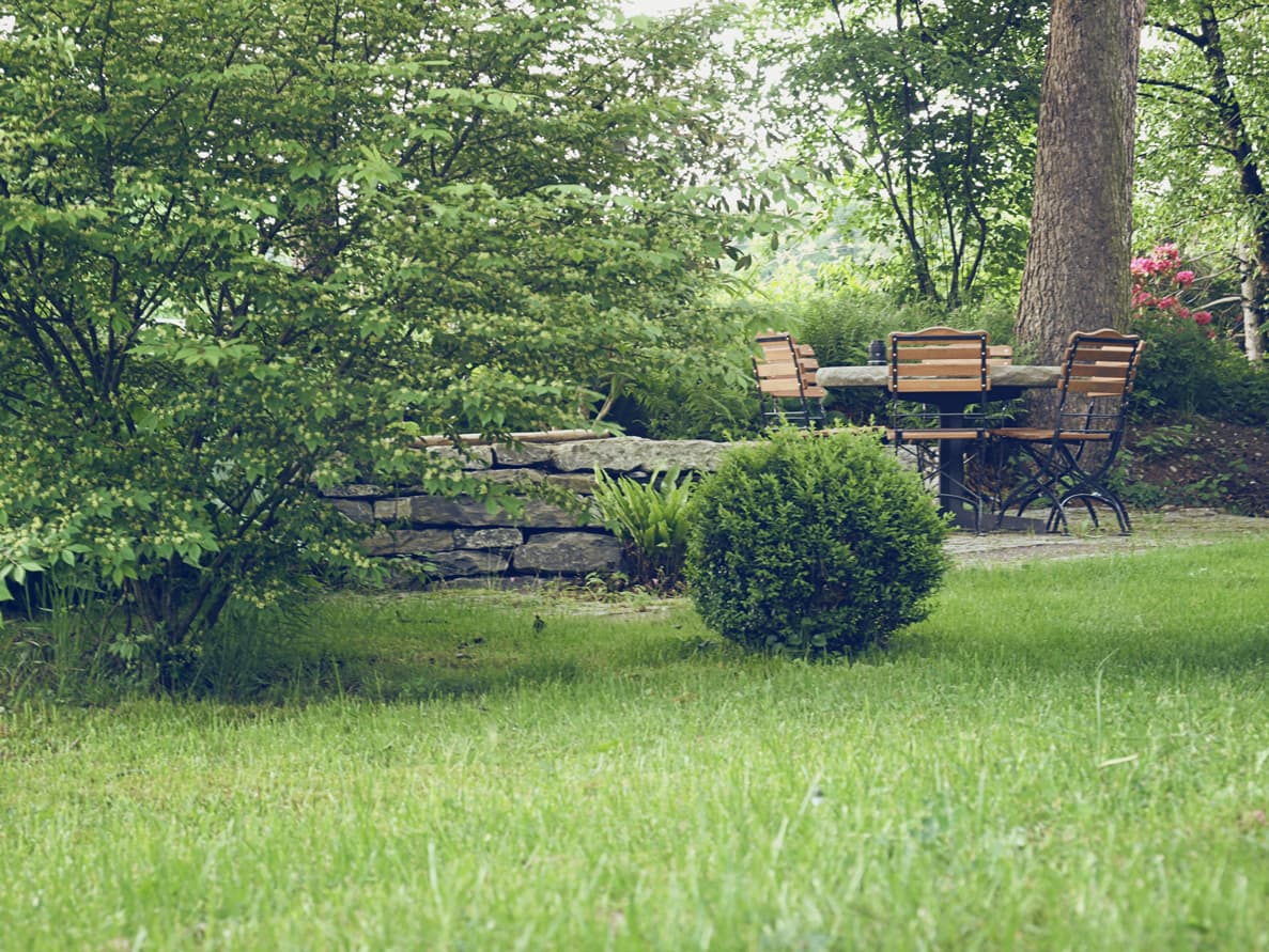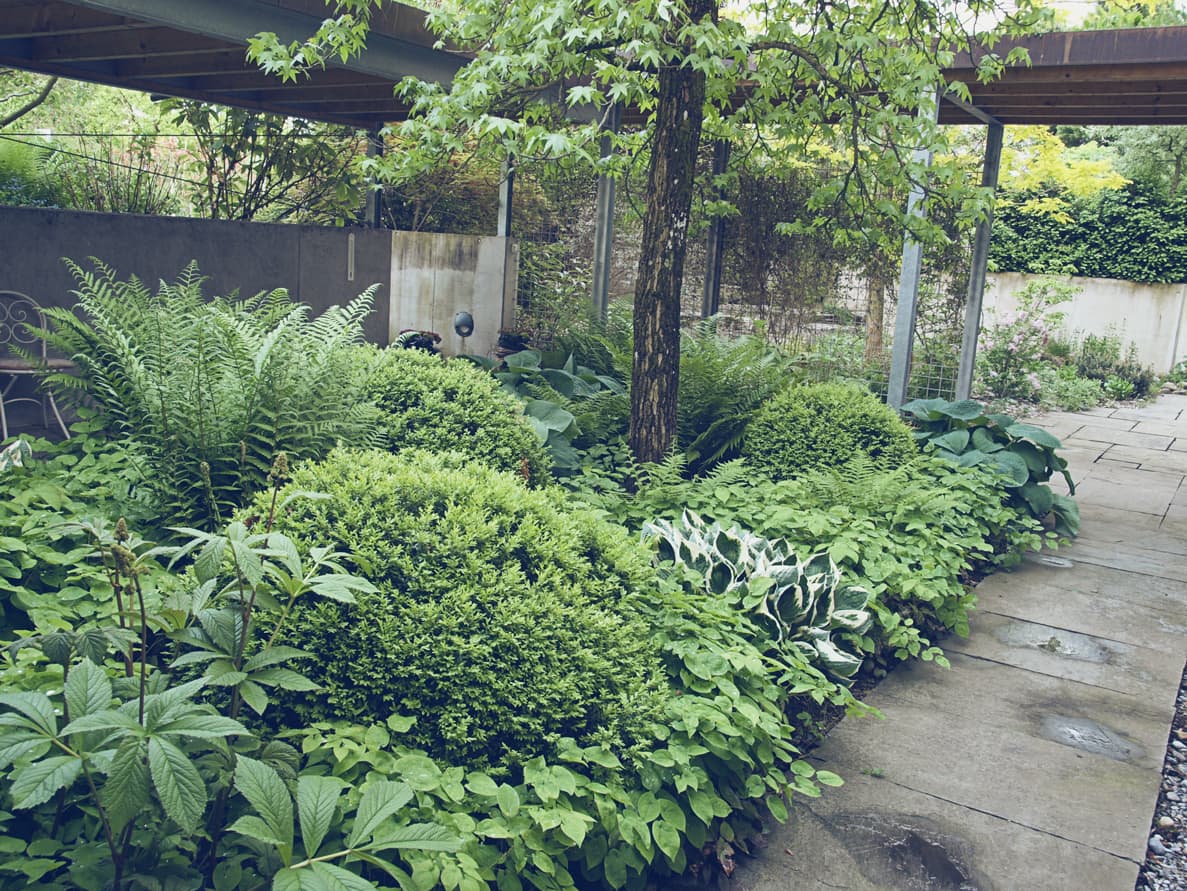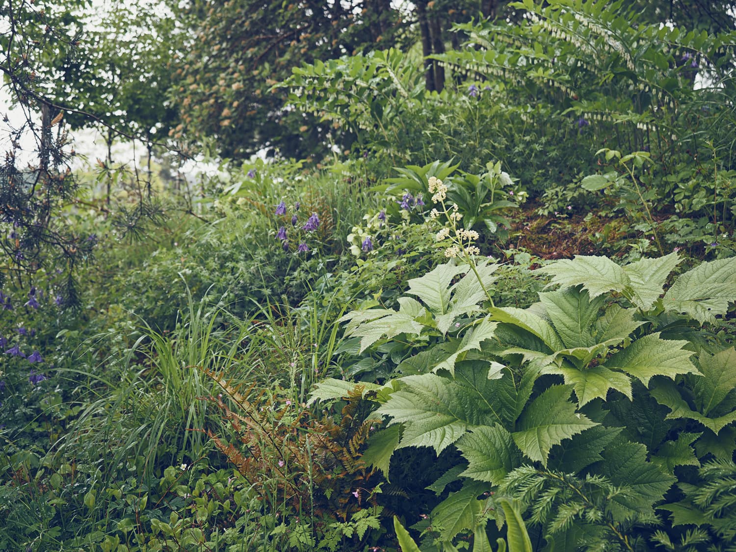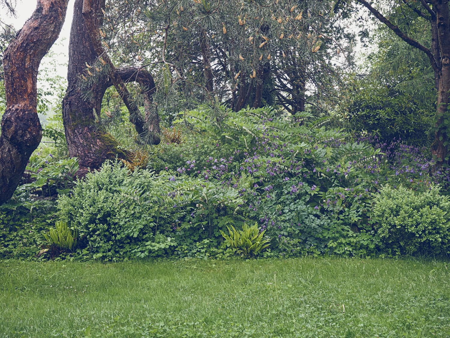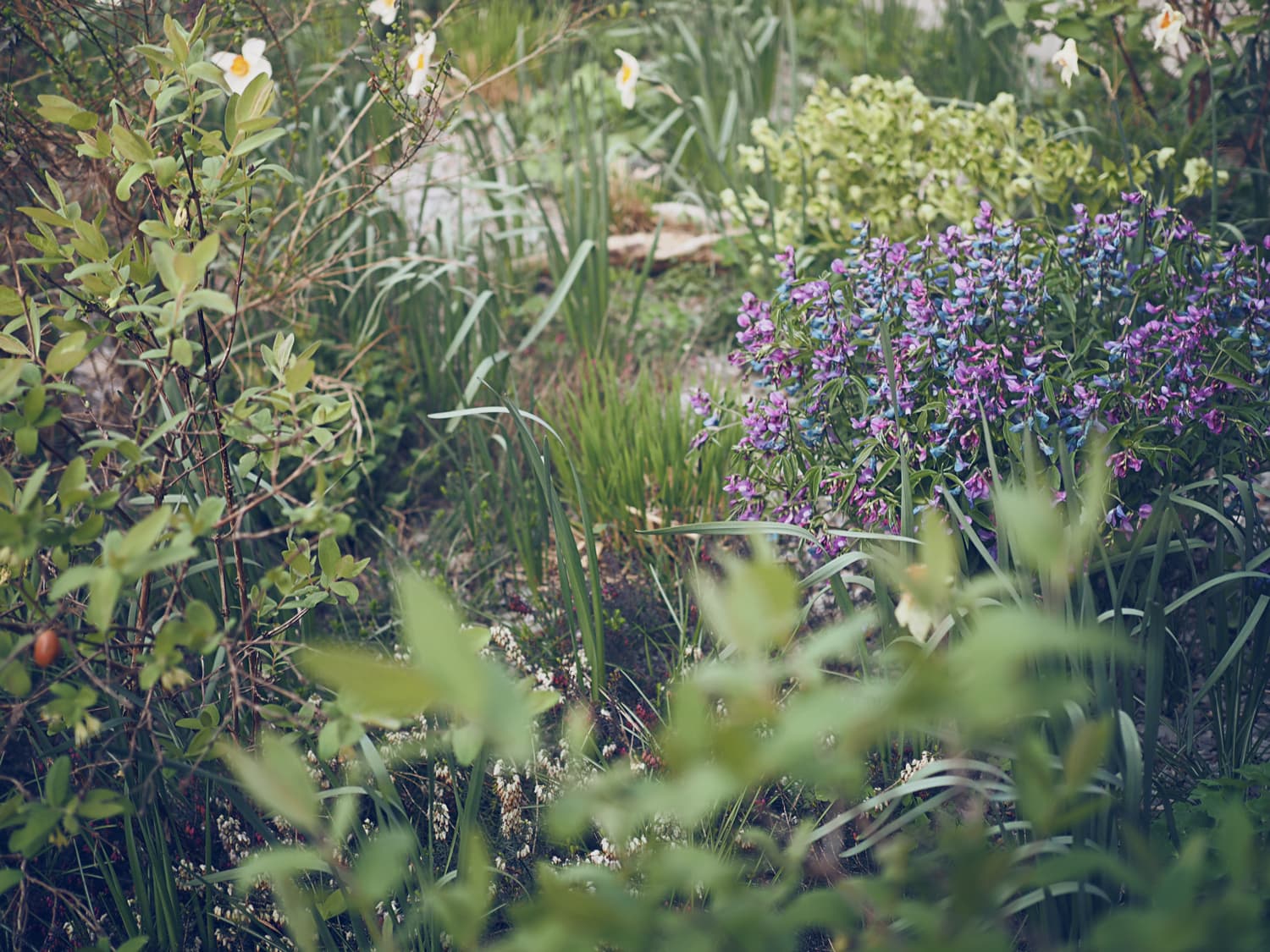Im Schattenbereich übernahmen grossblättrige Blattschmuckstauden das Gerüst der Bepflanzung, und wurden von aufstrebenden filigranen Salomonssiegel begleitet, welch auf dem Hügel einen besonderen Reiz haben. Im Sonnenbereich dominieren in der ersten Jahreshälfte Zwiebelpflanzen und Frühlingsblüher, welche von Frauenmantel, Oregano und Gräsern in den Herbst abgelöst werden.