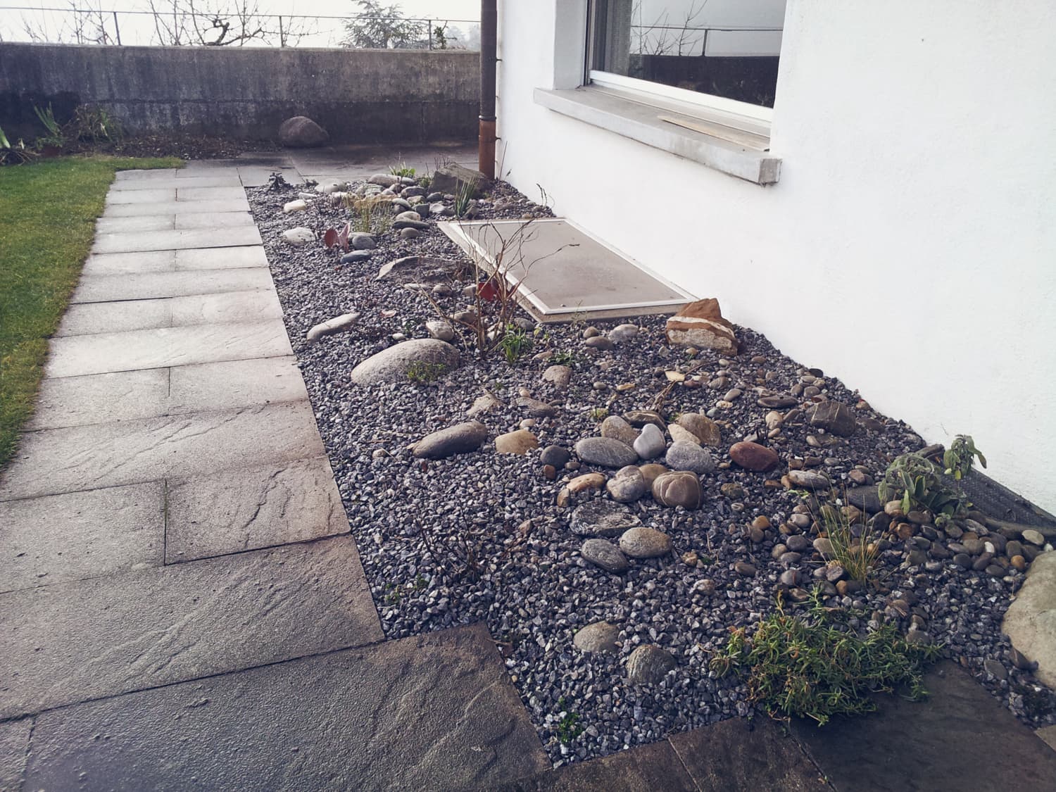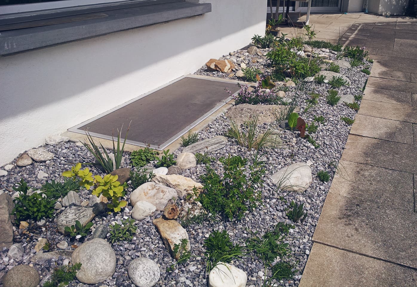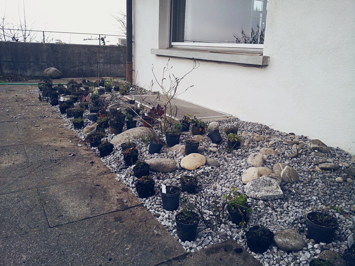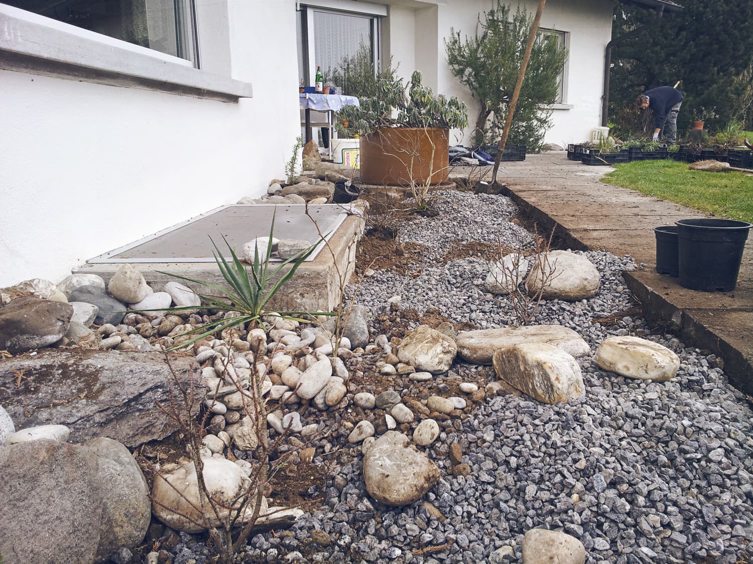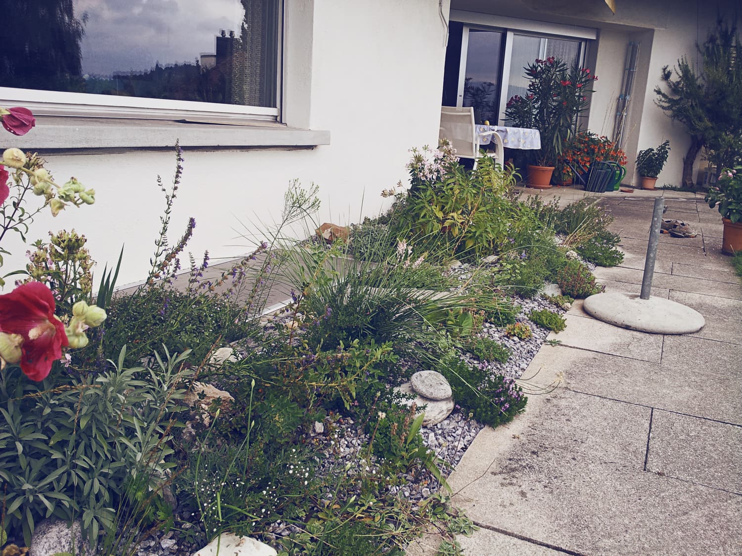Unter dem Dachvorsprung welcher nach Süden ausgerichtet ist soll es üppig und farbig werden. Die Pflanzen sollen klein bleiben und wenig Pflegeaufwand mit sich bringen. Der trockene und heisse Standort ist die Herausforderung.