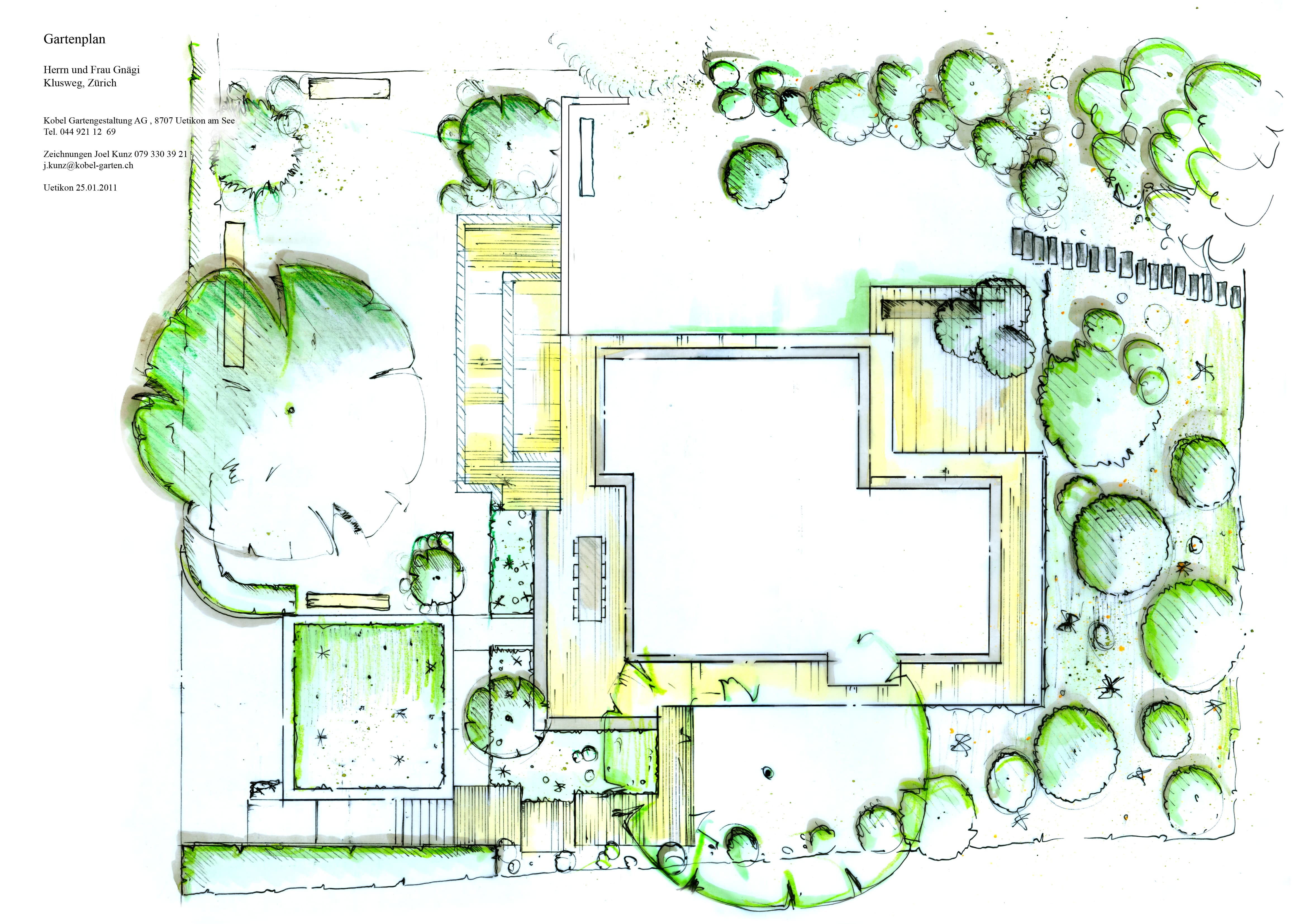 Das neue Haus befindet sich in einem alten Obst- und Pflanzgarten in Zürich. Im selben Kontrast, neu und alt, soll das Gartenkonzept gestaltet werden. Verschiedene Ebenen mit unterschiedlichen Nutzen sind so wichtig wie auch ein natürliches Bild.