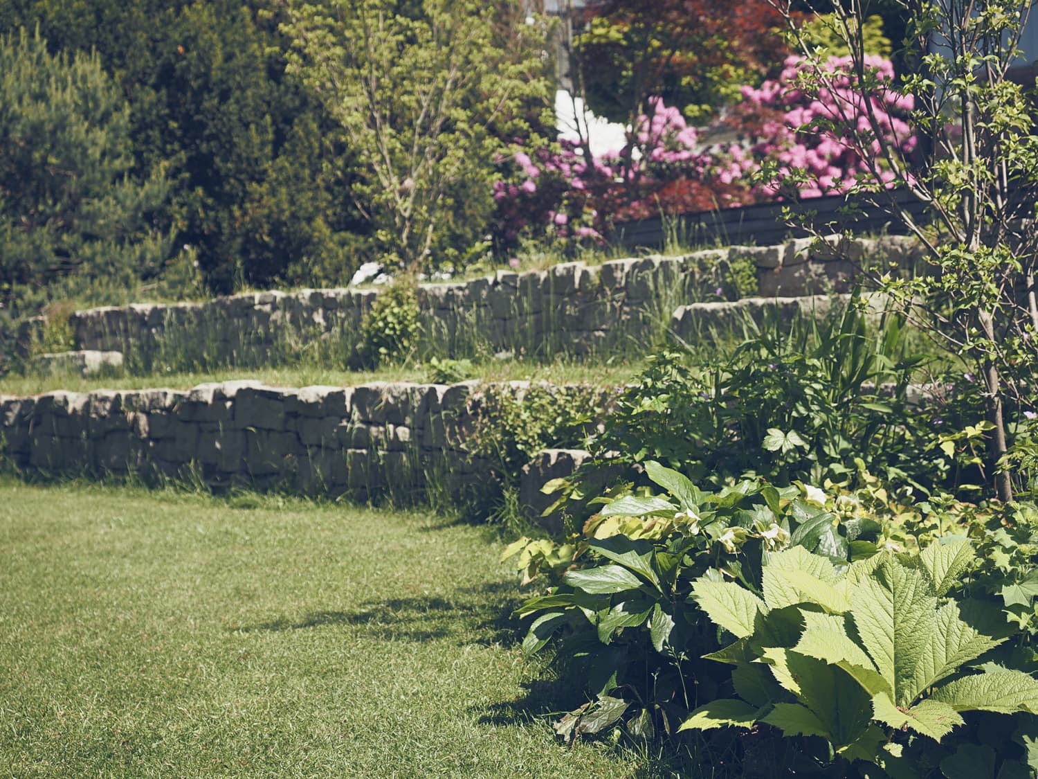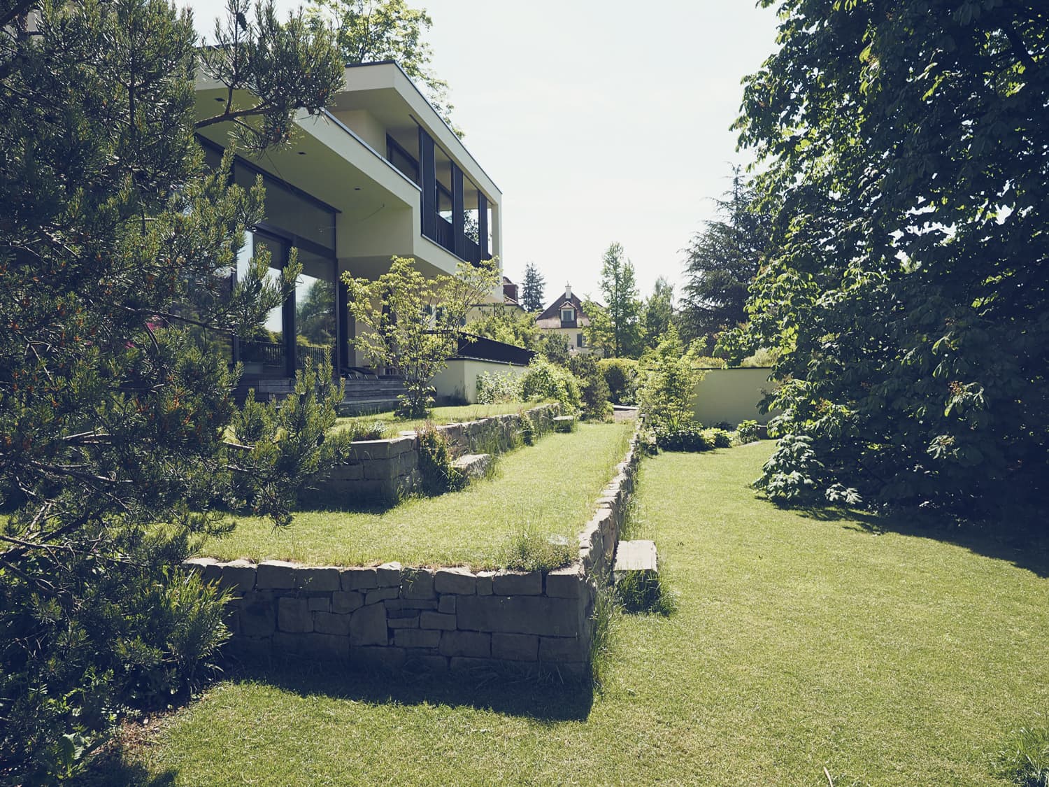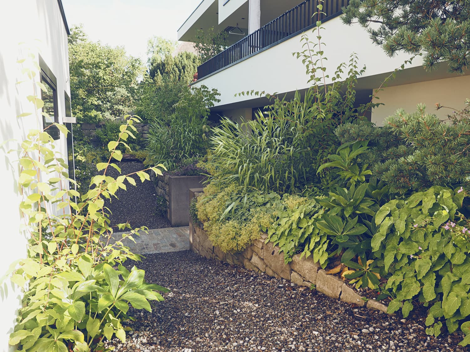 Eine grosse Herausforderung war die Terrassierung auf der Südseite. Der Höhenunterschied von 190 cm auf begrenztem Raum wurde zugleich als zentrales Gestaltungselement mit Natursteinmauern realisiert. Die Dachflächen sind von vielen Seiten, Fenstern oder Nachbarn gut einsehbar und darum in der Gestaltung wichtig. Gepflanzt wurden Stauden und Gehölze welche bis zu 1 Meter hoch werden und eine üppige Flora auf die Dächer bringt.