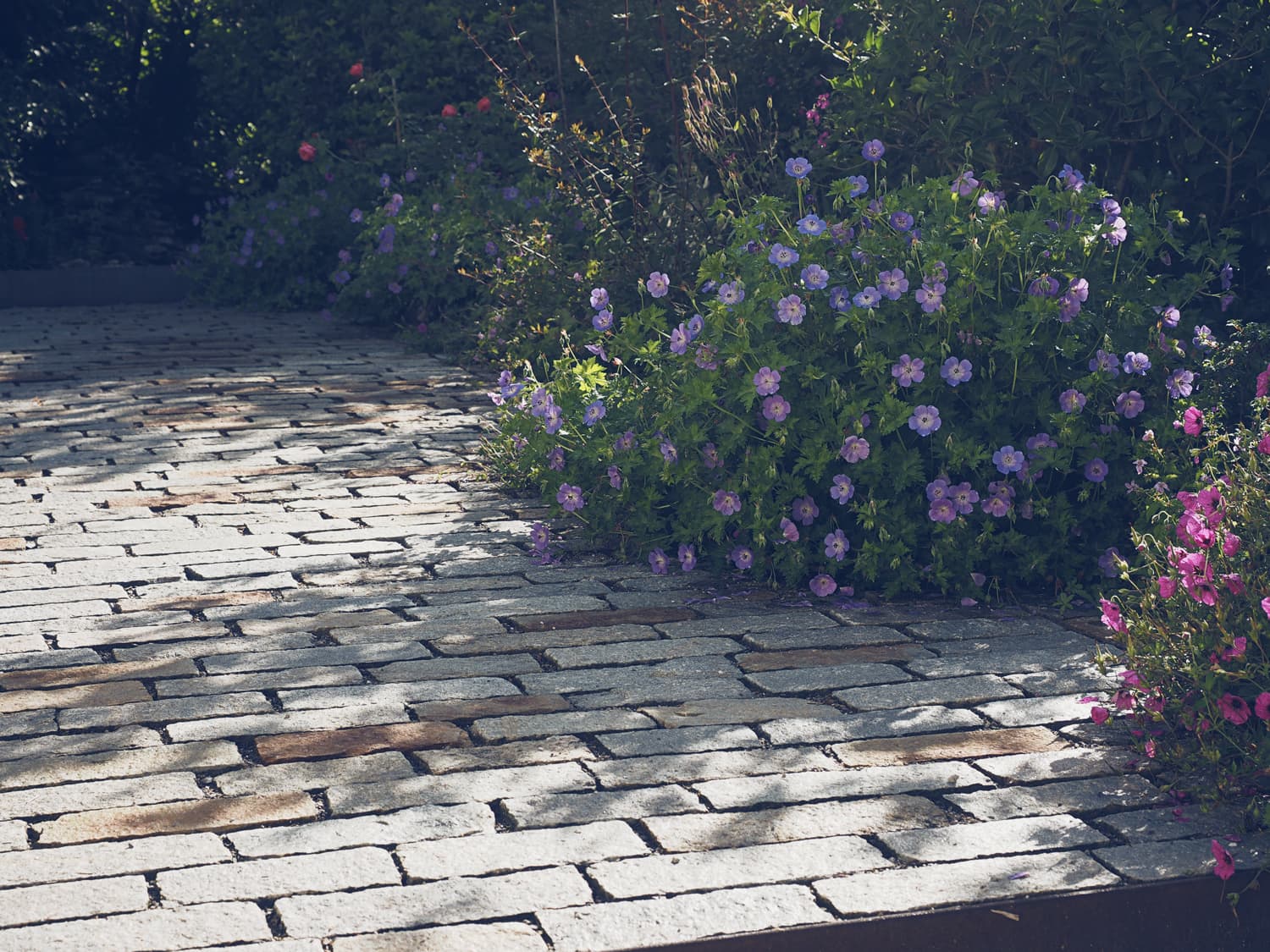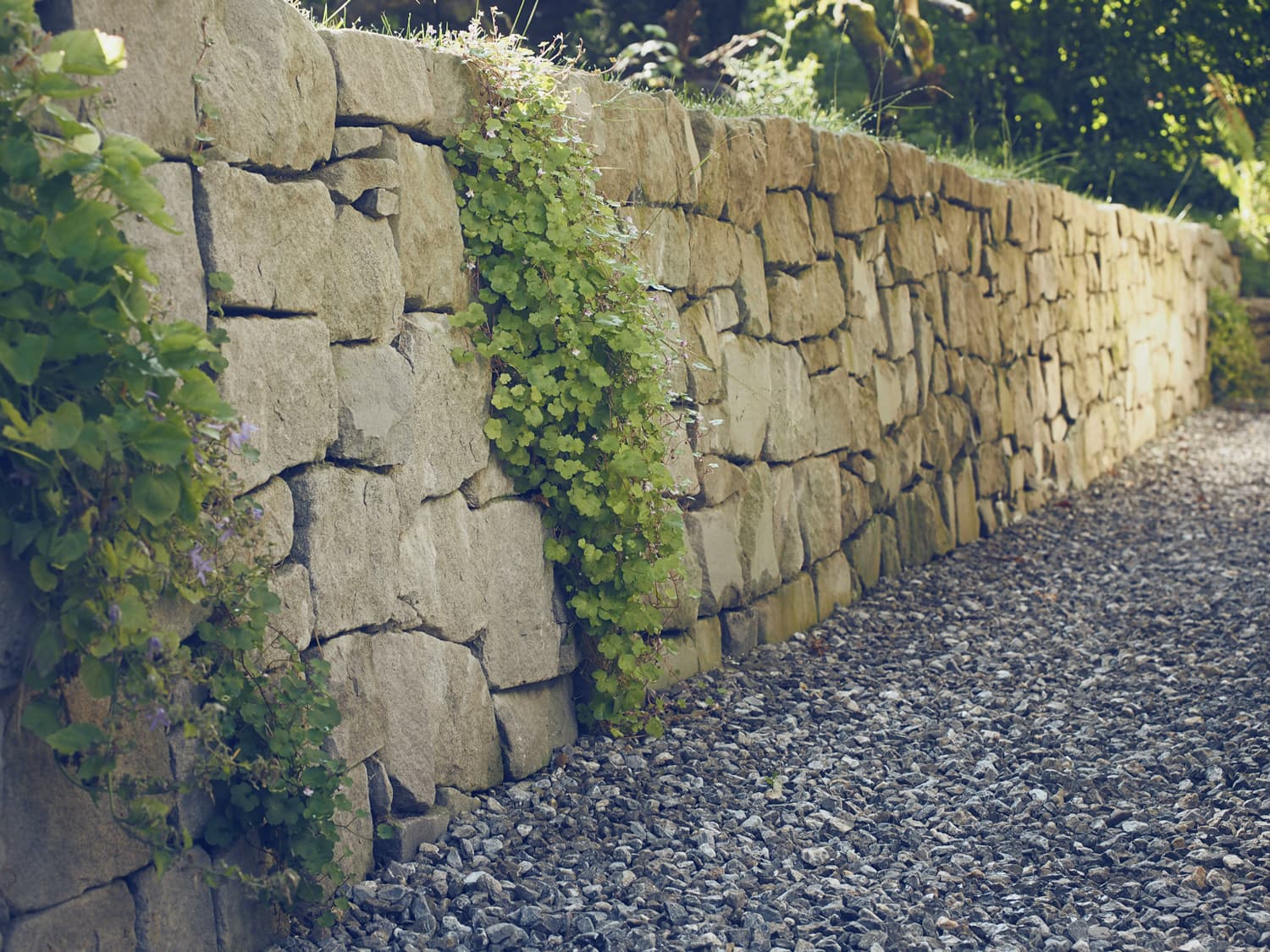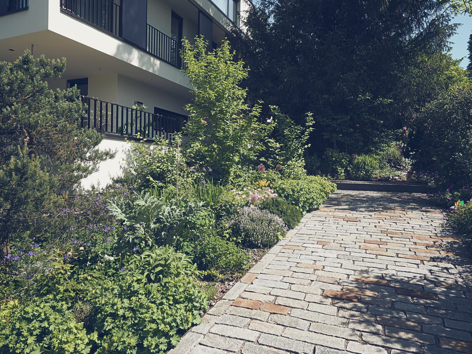 Eine grosse Herausforderung war die Terrassierung auf der Südseite. Der Höhenunterschied von 190 cm auf begrenztem Raum wurde zugleich als zentrales Gestaltungselement mit Natursteinmauern realisiert. Die Dachflächen sind von vielen Seiten, Fenstern oder Nachbarn gut einsehbar und darum in der Gestaltung wichtig. Gepflanzt wurden Stauden und Gehölze welche bis zu 1 Meter hoch werden und eine üppige Flora auf die Dächer bringt.