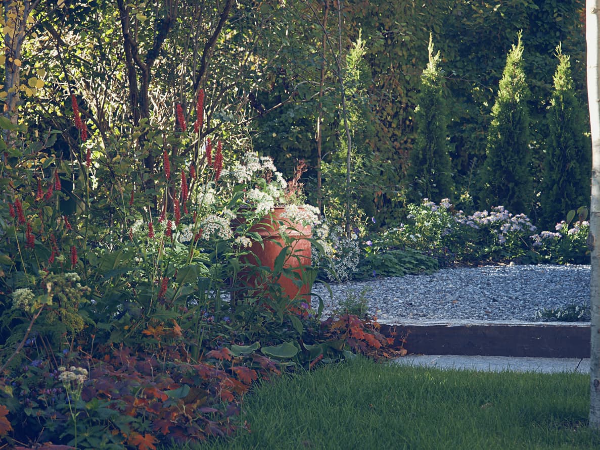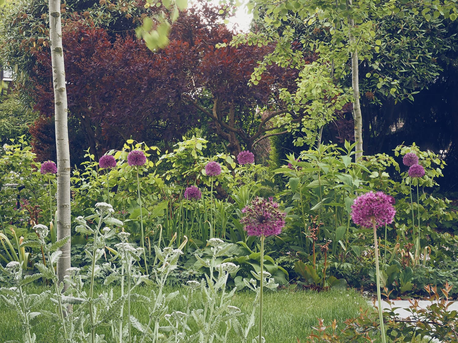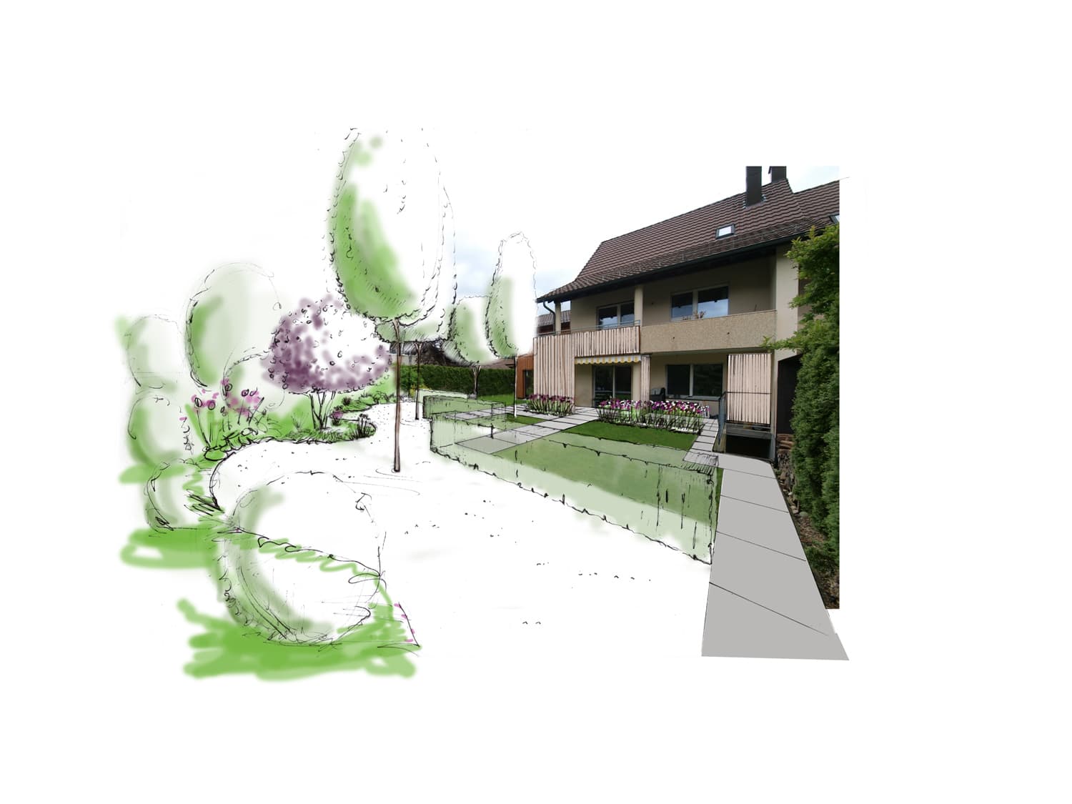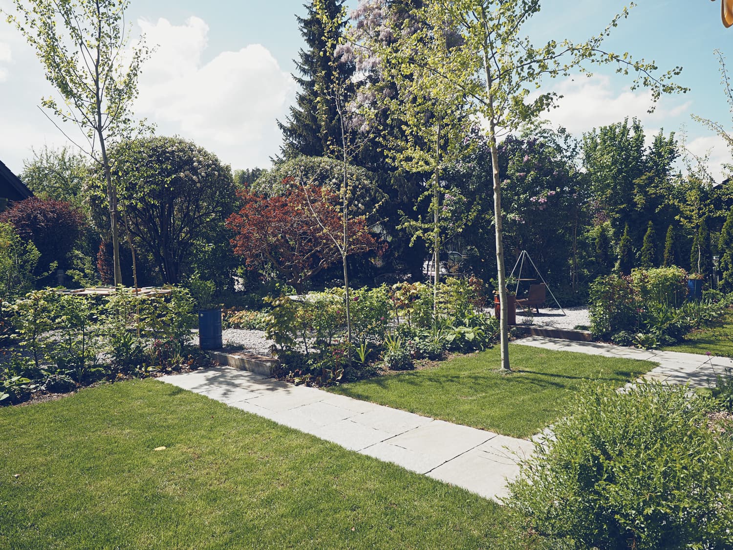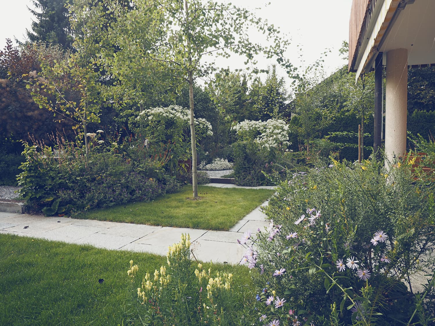 Gestalterisch wurden die geraden Linien vom Gebäude mit der geschwungenen Linienführung der bereits existierenden Gehölzen verbunden. Entstanden ist ein formaler Bereich in Hausnähe, ein Übergangsbereich in der Mitte mit Rasen und Pflanzflächen sowie ein natürlich gehaltener Bereich mit Anbindung an die bestehende Bepflanzung. Dieser Garten zeichnet sich durch das Zusammenspiel und dem Kontrast von geometrischen Formen und der üppigen Flora aus.